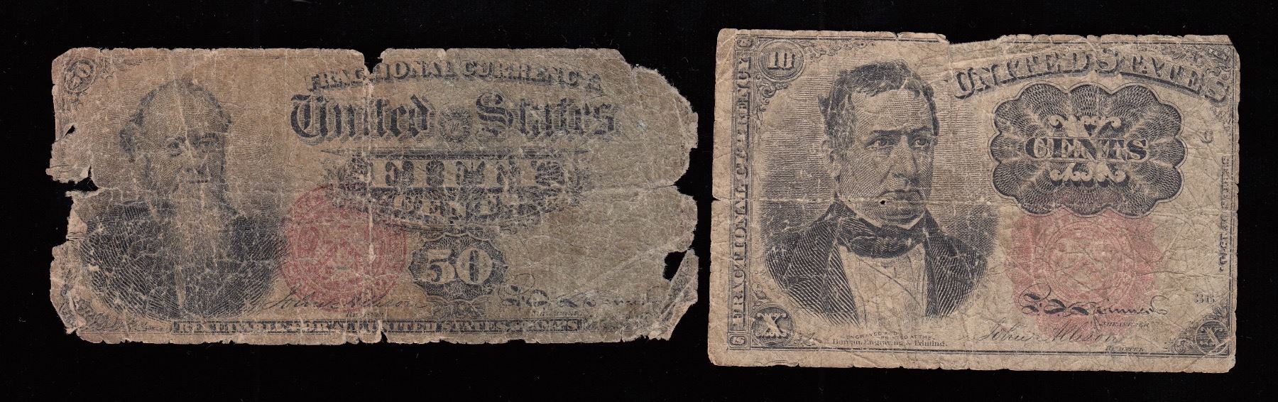 Fractional Currency - 4th Issue 50 cents Stanton Face & 1864 10 Cents. Lower conditions. 2 Pcs.