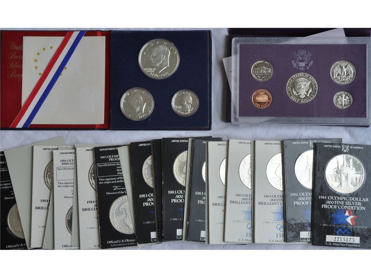 (3) 1983 Olympic Dollar, in Philadelphia mint holder; (4) 1983 Olympic Dollar in San Francisco mint holder; (3) 1984 Olympic Dollar in Philadelphia mint holder; (4) 1984 Olympic Dolla in San Francisco mint holder; US Mint Proof Set 1993 P-D; US Bicentennial Silver Proof Set 1776-1976 3-piece. 16 Pcs.
