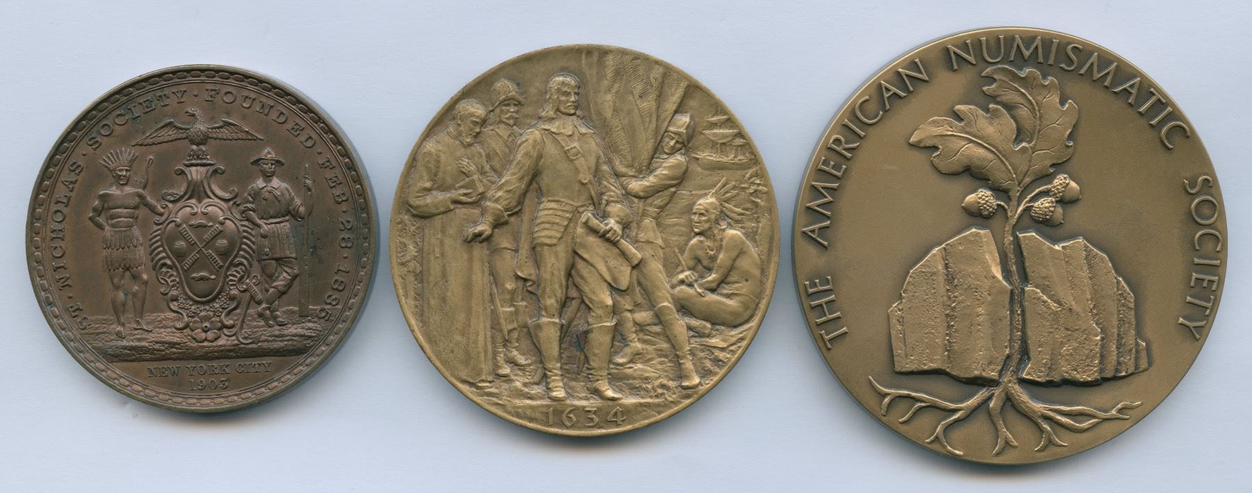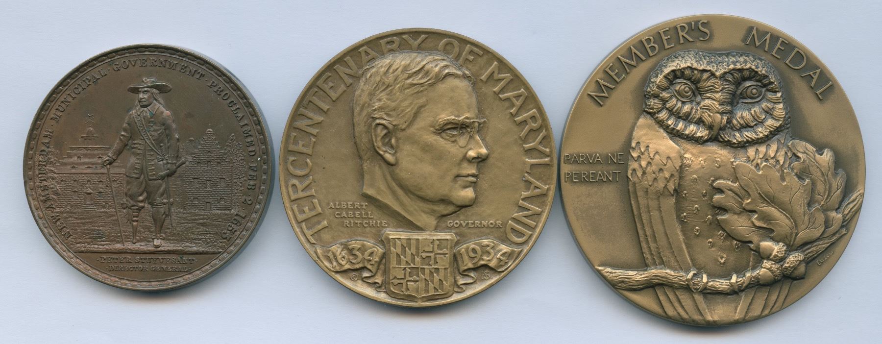 1.) 1634-1934 Tercentenary of Maryland, bronze, 57mm, produced by Medallic Art Company, NY. 2000 struck 2.) 1653-1903 New Amsterdam 250th Anniversary Medal, bronze, 50mm, produced by Tiffany & CO. Commemorating the 250th anniversary of municipal government of New Amsterdam. 3.) 1634-1934 American Numismatic Society Medal, designed by Frank Eliscu, 64mm, 5 oz. 3 pcs.