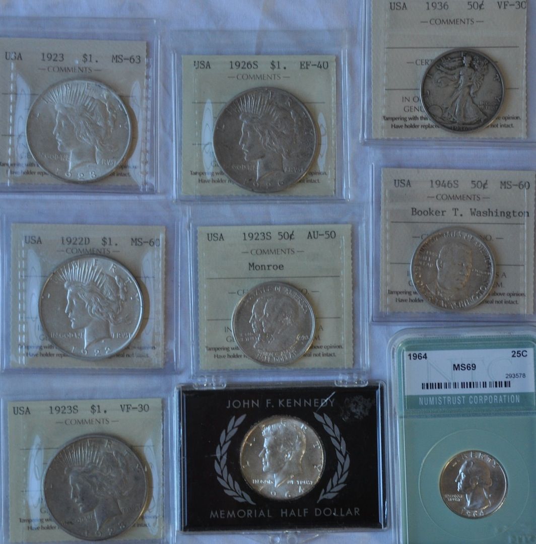 1922D Dollar, ICCS MS-60; 1923S Monroe Half Dollar, ICCS AU-50; (2)1923 Dollar, ICCS VF-30 “S”, ICCS MS-63; 1926S Dollar, ICCS EF-40; 1936 Half Dollar, ICCS VF-30; 1946S Half Dollar, Booker T. Washington, ICCS MS-60; 1964 Half Dollar (in mint case); 1964 Quarter Dollar, NTC MS69. 9 Pcs.