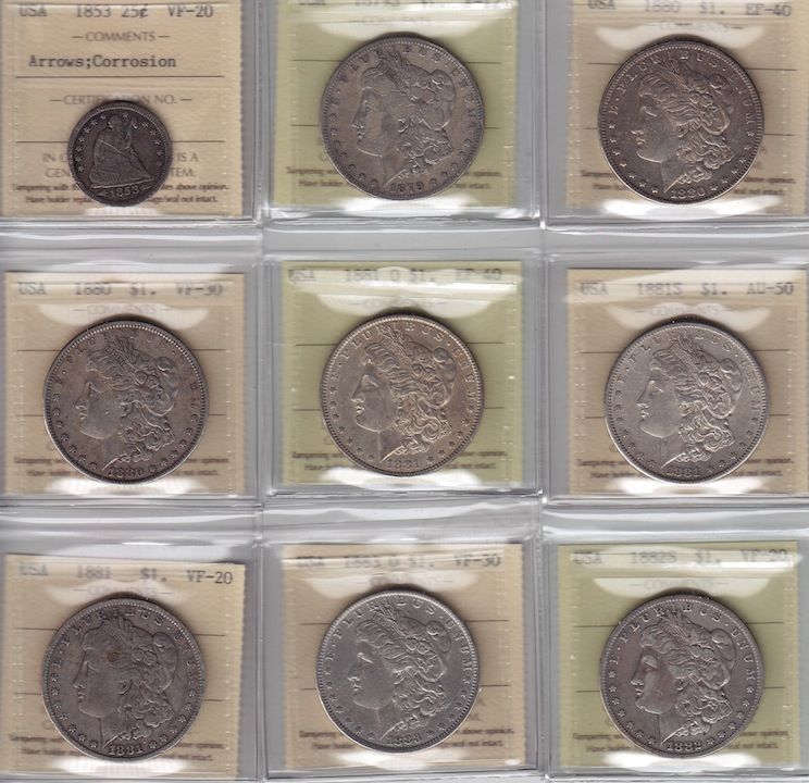 1853 Quarter Dollar - Arrows, VF-20 (corrosion); 1879S Dollar, F-12; (2) 1880 Dollar, EF-40 and VF-30; (3) 1881 Dollar, EF-40 (“O”), AU-50 (“S”), and VF-20 (no letter); 1882S Dollar, VF-20; 1883 Dollar, VF-30. 9 Pcs.