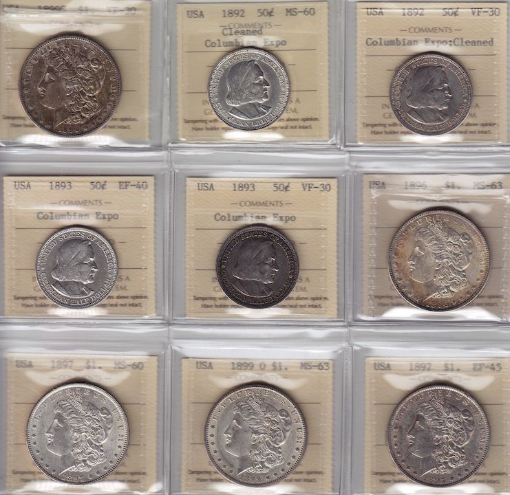 1890S Dollar, ICCS VF-30; (2) 1892 Half Dollar, Columbian Exposition, ICCS MS-60 (cleaned), ICCS VF-30 (cleaned); (2) 1893 Half Dollar, ICCS EF-40, ICCS VF-30; 1896 Dollar, ICCS MS-63; (2) 1897 Dollar, ICCS MS-60; ICCS EF-45; 1899 “O” Dollar, ICCS MS-63. 9 Pcs.