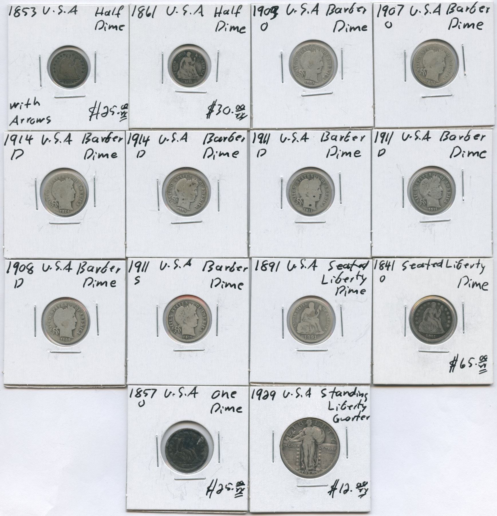 Includes Half Dimes: 1853 & 1861. Dimes: 1841O, 1857O, 1891, 1903O, 1907O, 1908D, 1911S, 2 x 1911D, 2 x 1914D. Quarters: 1929. 14 pcs.