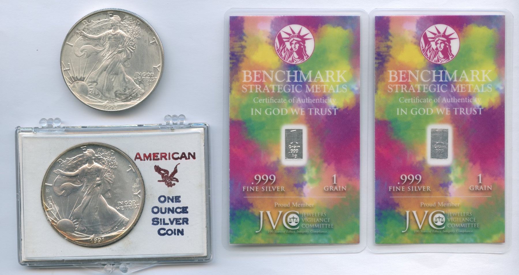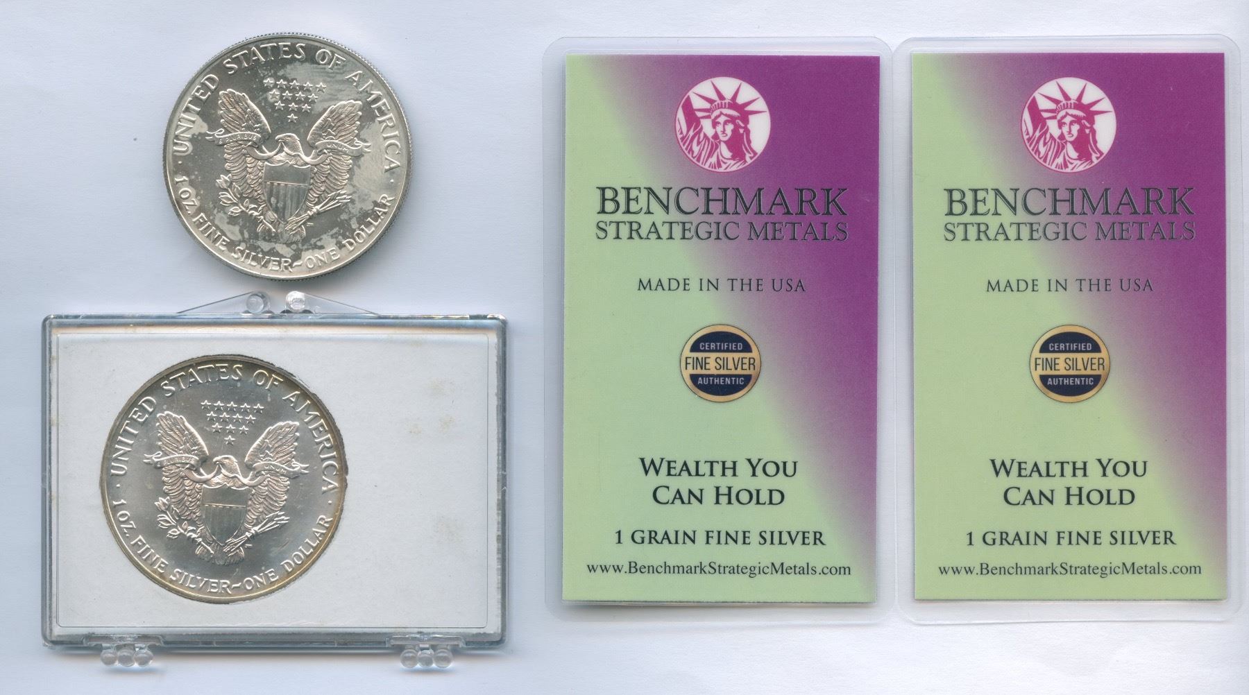 Includes two silver eagles and two .999 fine silver 1 grain bars. 4 pcs.