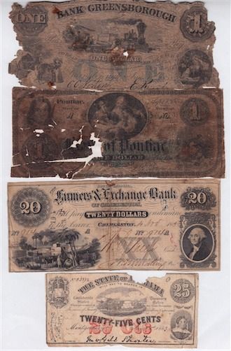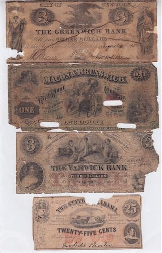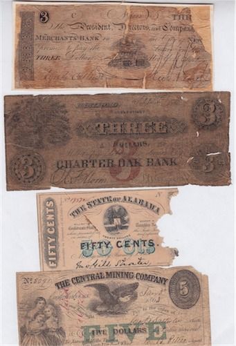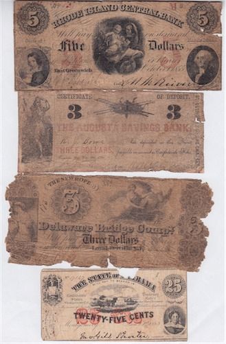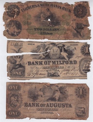 USA - Lot of 23 Obsolete Banknotes Dating 1820s-1850s. All low grade and/or damaged notes. Some have rips or pieces missing & staining. Some scarce issues & all notes different. Should be viewed. 23 Pcs.