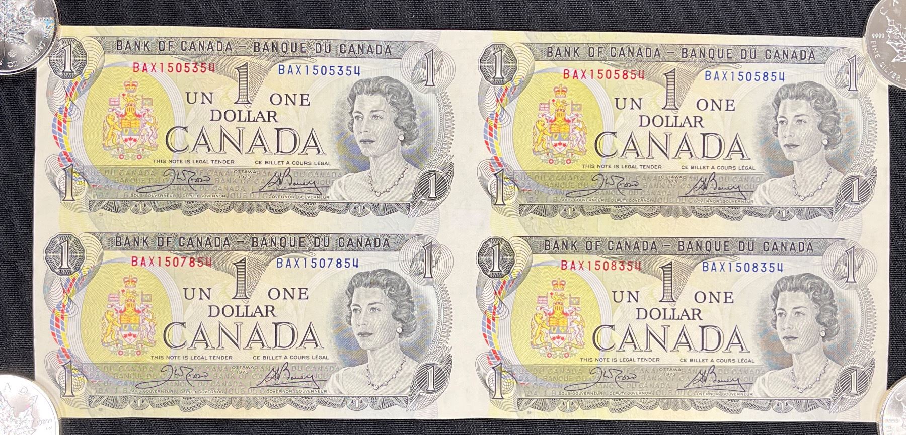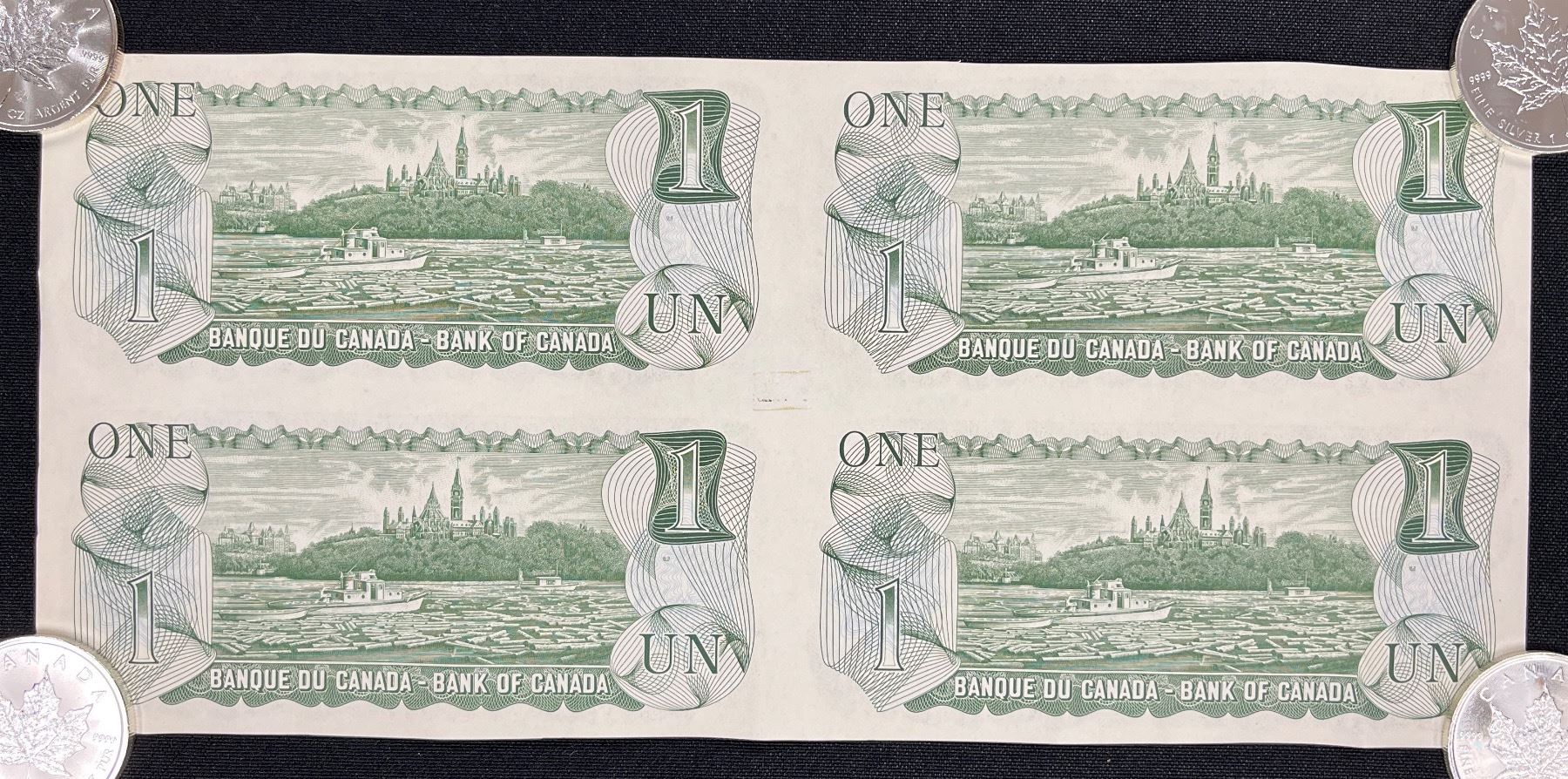 Uncut Sheet of 4 x 1973 $1 Banknotes from an uncut BAX sheet