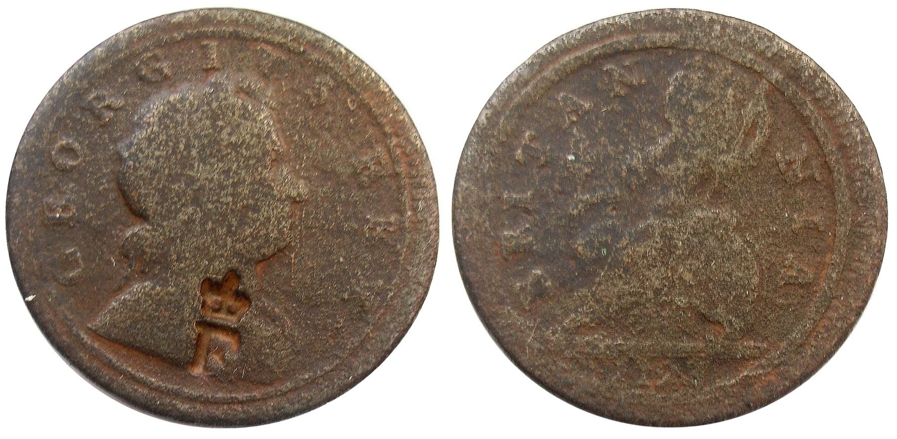 Undated Crowned F countermark on a 1723 George I British Halfpenny Dump Issue. Very Fine, the host coin with a light but even roughness, but with everything visible. The countermark is sharp at the base of the obverse, the coin thick enough to not show much flattening on the side opposite. When this type of countermark first appeared it was assumed to be a previously unknown French Colonies issue, but a number of specimens appeared in a short period of time, and all were over various British copper coins – not exactly the type of coin that would be welcomed in France or its colonies, which were at war with England for much of the previous few centuries! Today it is thought that these were likely produced in the early 20th century to fool collectors. The present example is from the Mike Ringo collection.
