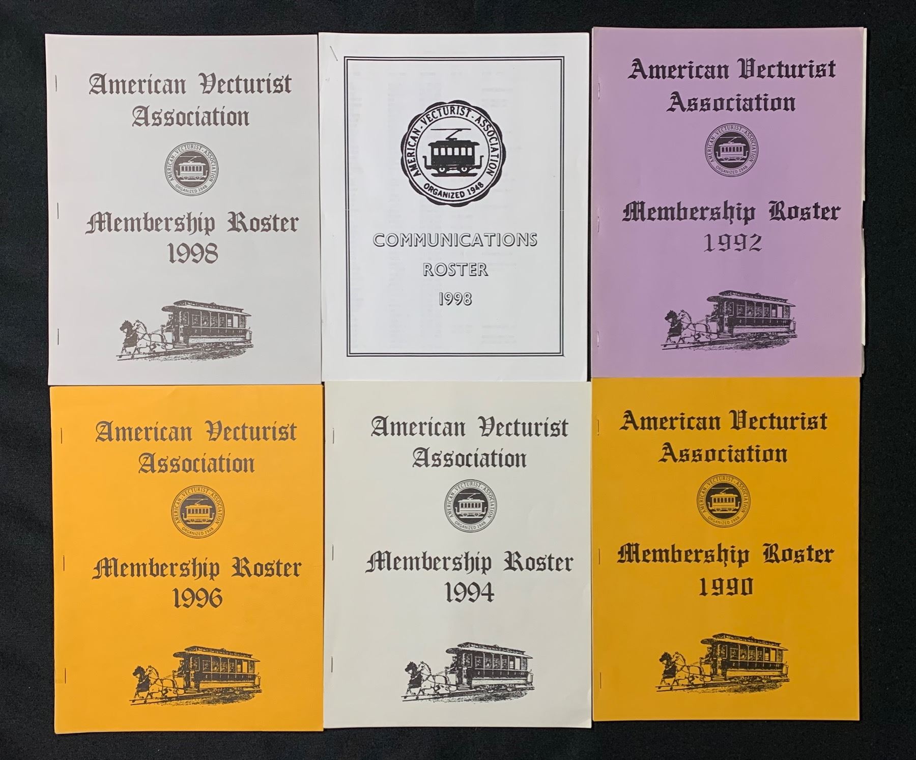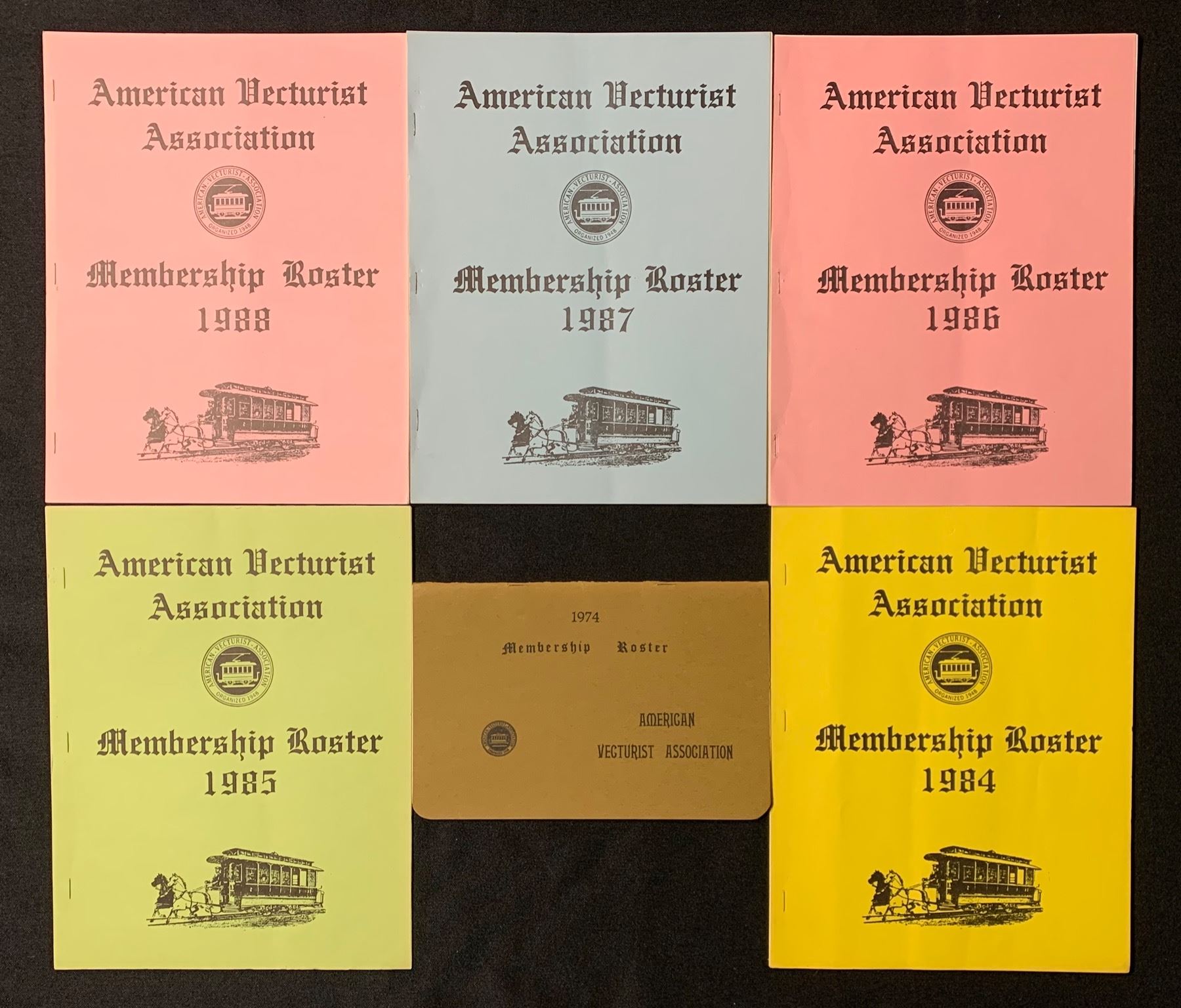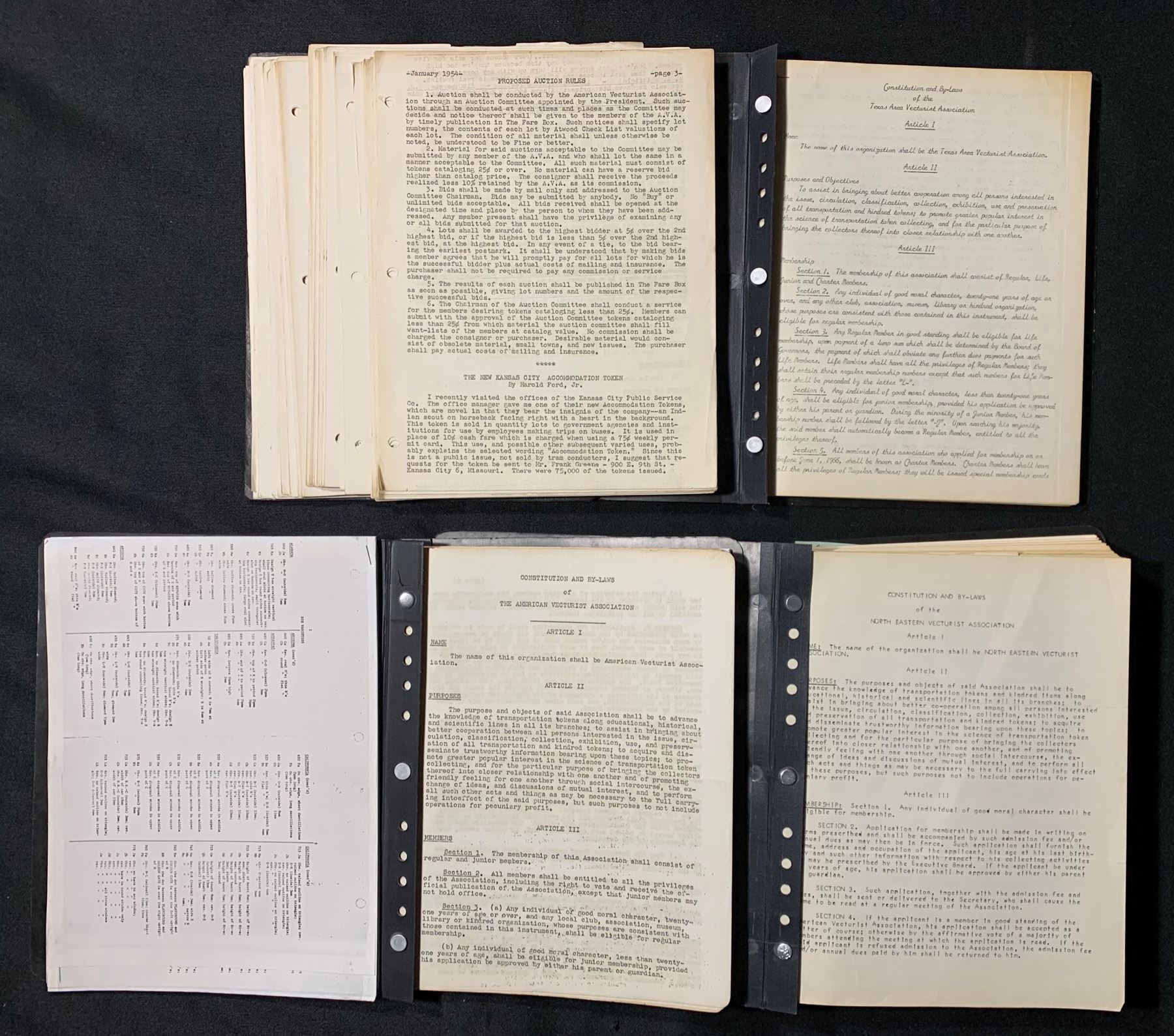 Token Talk, Texas Vecturist Association, 1966-1971; American Vecturist Association Membership Rosters 1974-1998; a thick binder of newsletters of the North Eastern Vecturist association; another 3 binders of early Vecturist newsletters. A very interesting lot for the transportation collector. ex John Cassidy.