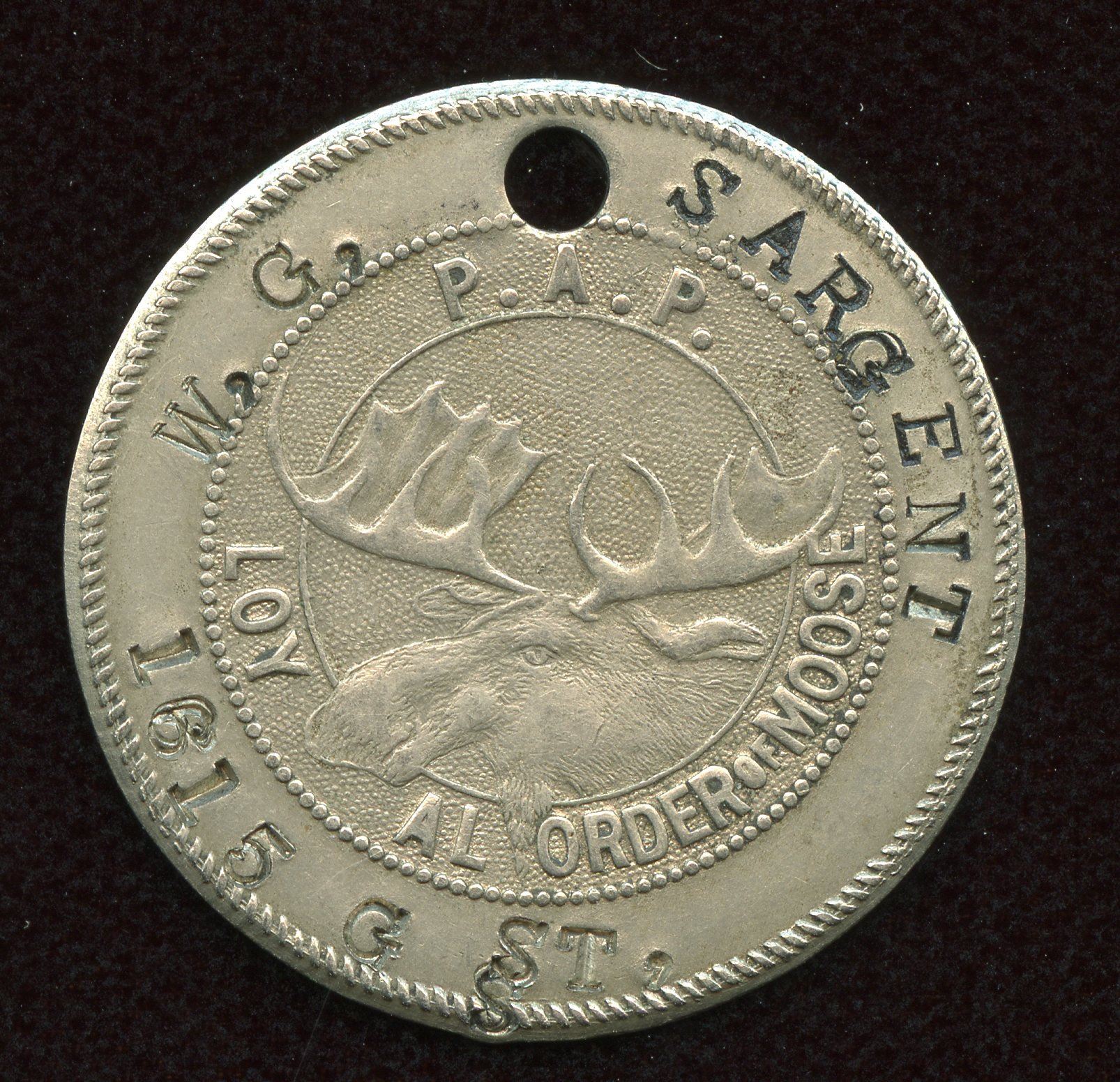 Silver Loyal Order of Moose, personalized with a traceable name and address. Should be researched.
