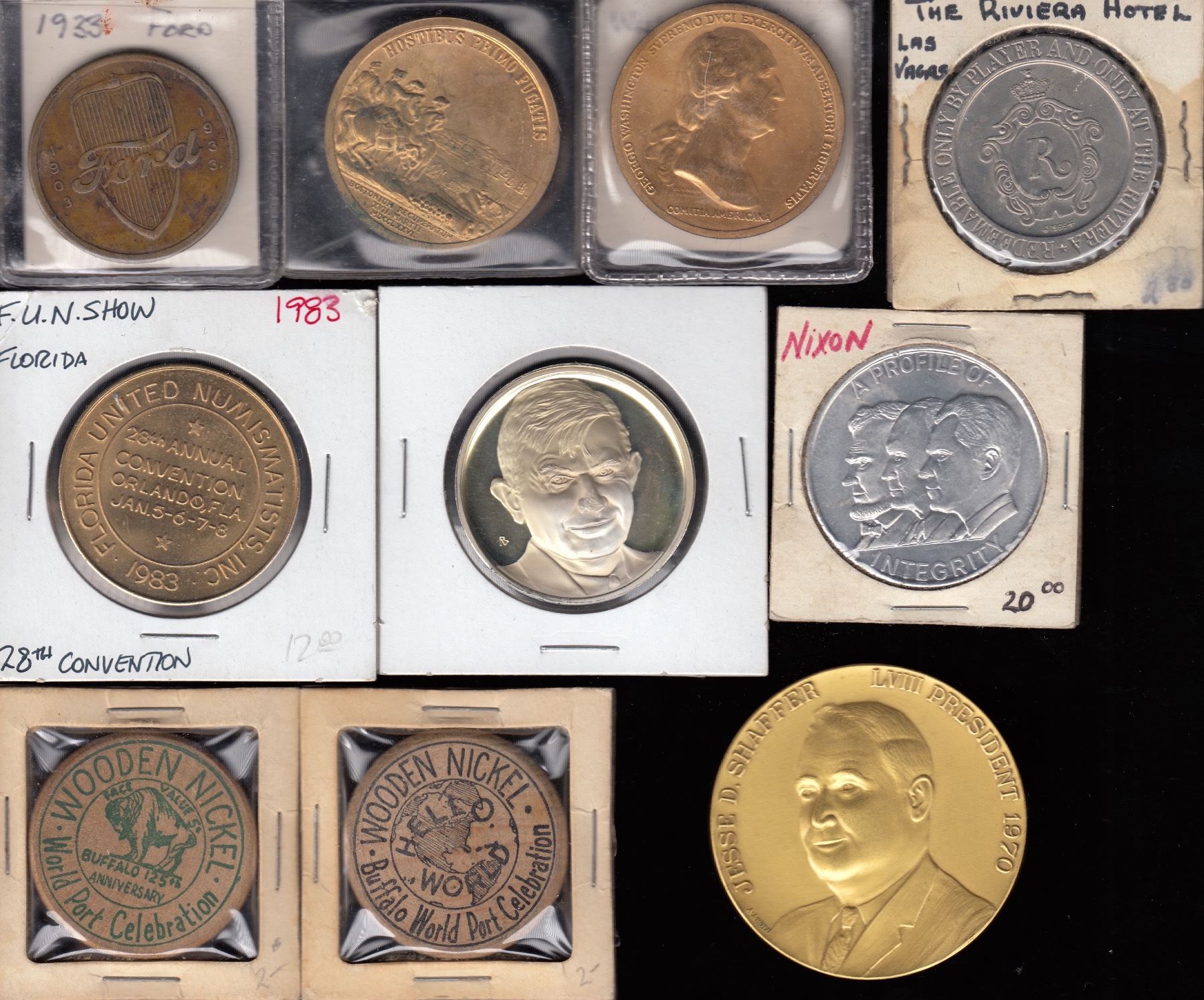 1933 Ford Motor Co., 30th Anniversary bronze; Washington Looking over Boston, Comita Americana( 2 pcs); Aluminum Republican Nixon medal; Rochester Numismatic Association President's medal of Jesse D. Schaffer; 1983 FUN medal; American Indian Collection silver Will Rogers; 2 Buffalo wooden nickels dated 1957; Las Vegas Rivierra Horel dollar. Lot of 10 pcs.