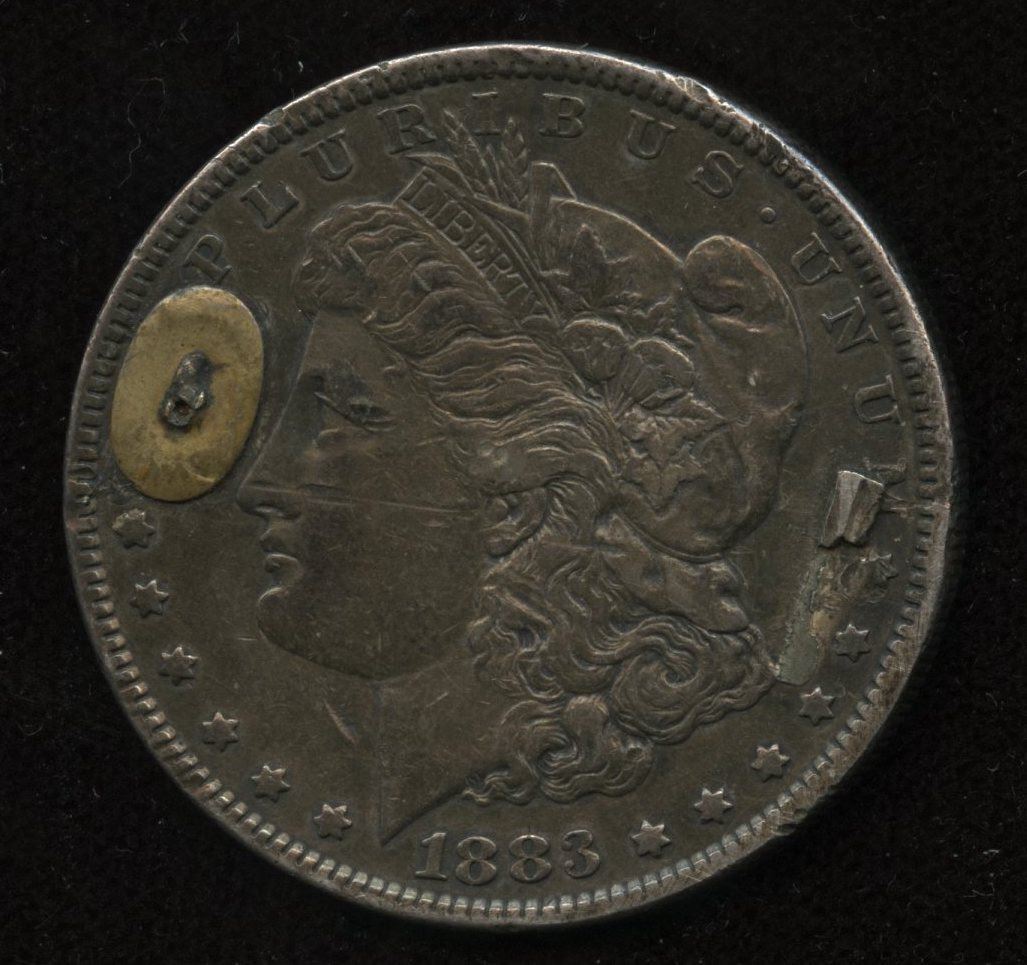 Silver dollar dated 1883, made into a love token. Beautiful engraving on the reverse. It appears to have once been a pin as there are 2 solder marks on the obverse.