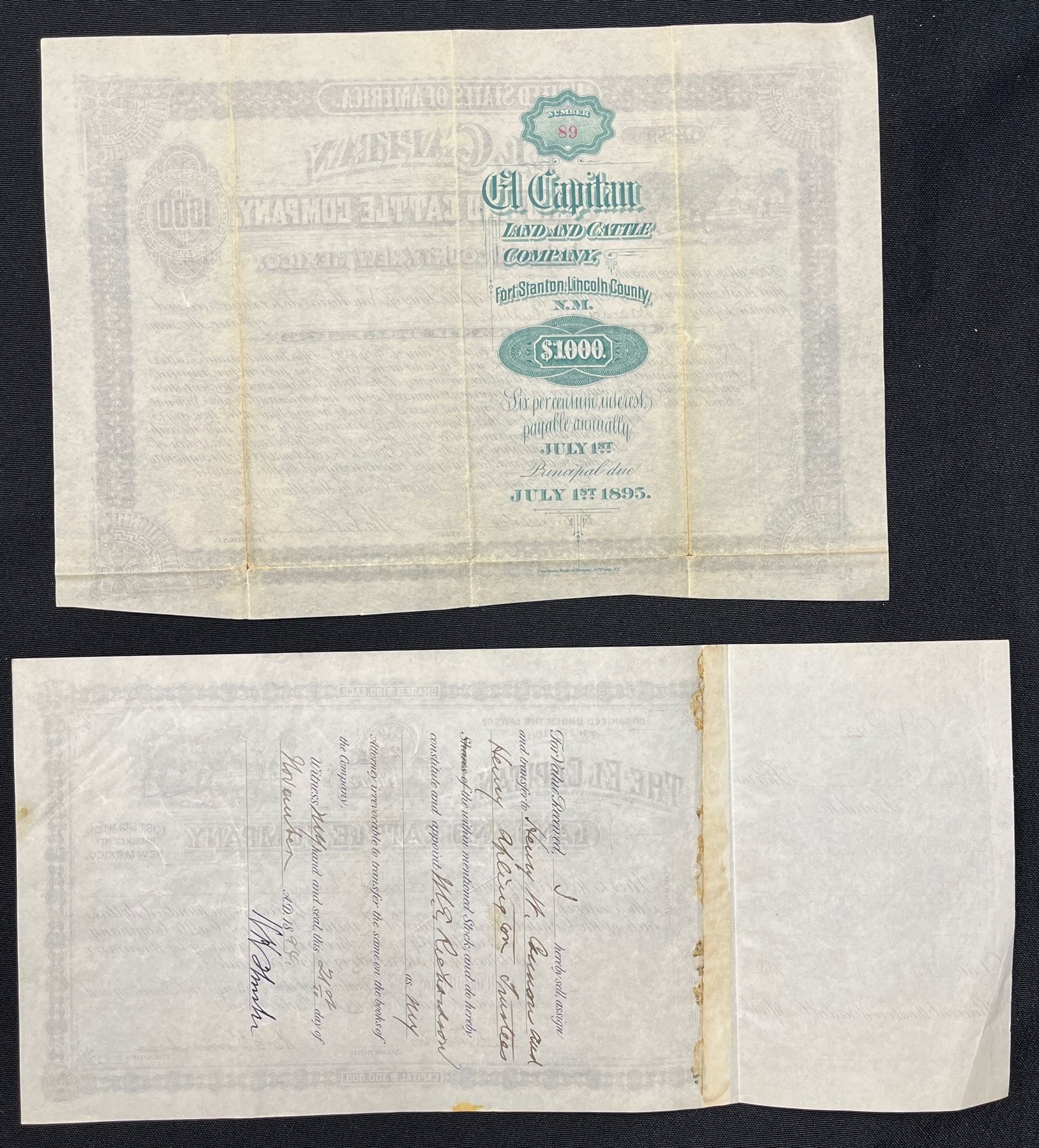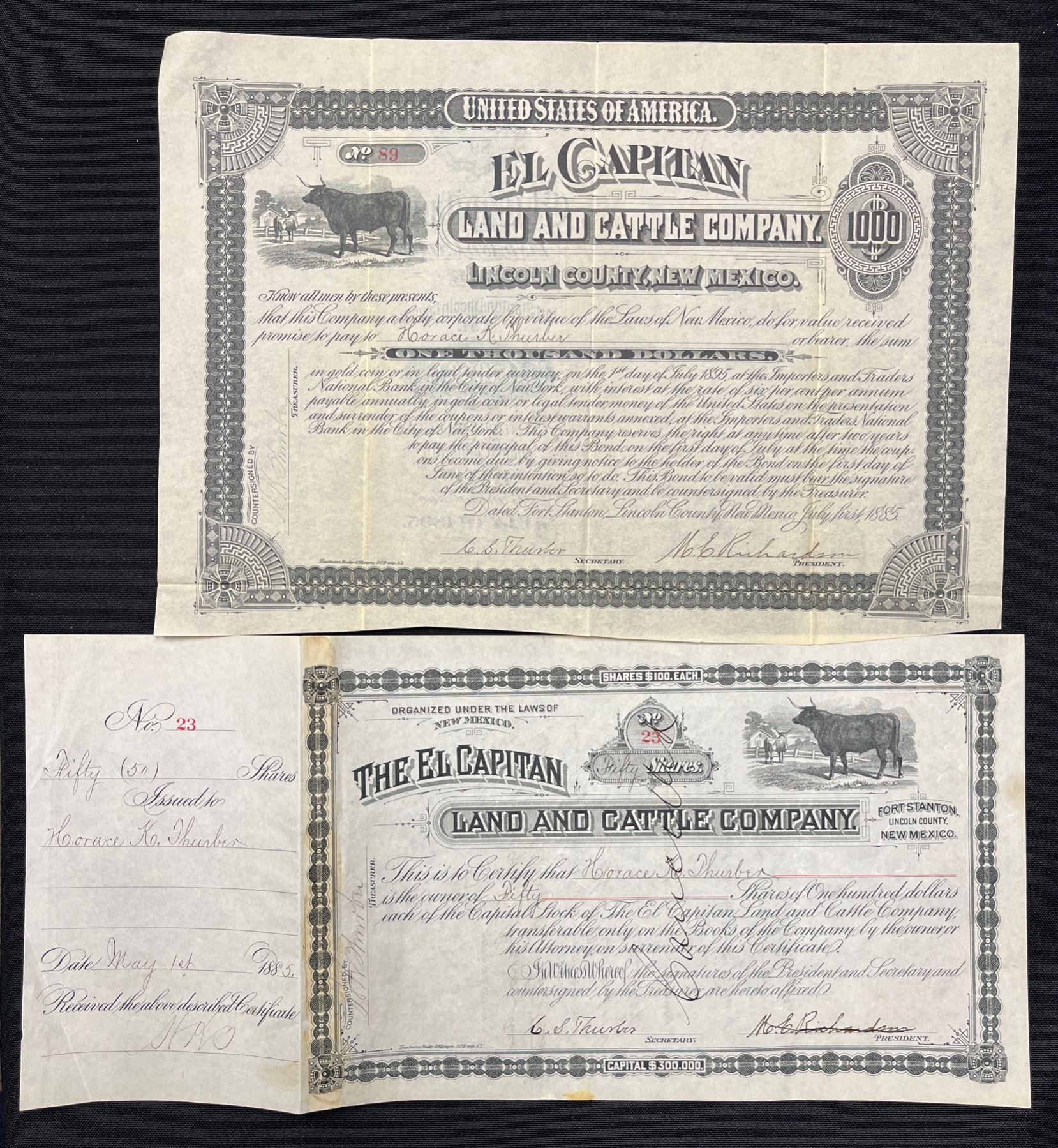 This lot comprised of 2 pieces: certificate #23 for 50 shares, includes stub. Also included is $1000 bond, 1895. 2 nice pieces with a nice Bull vignette. 2 pcs.