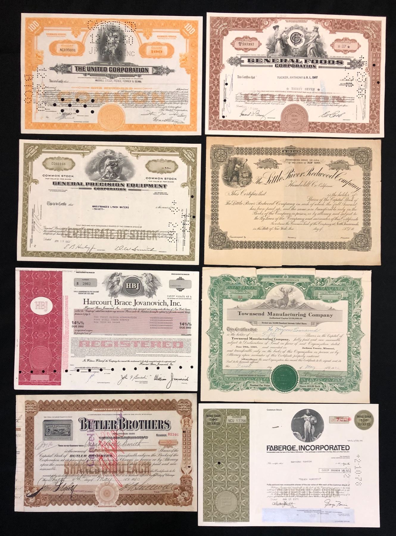United States, stock and bond certificates. Eight different documents, all with at least one vignette, dates from before 1900 to modern.