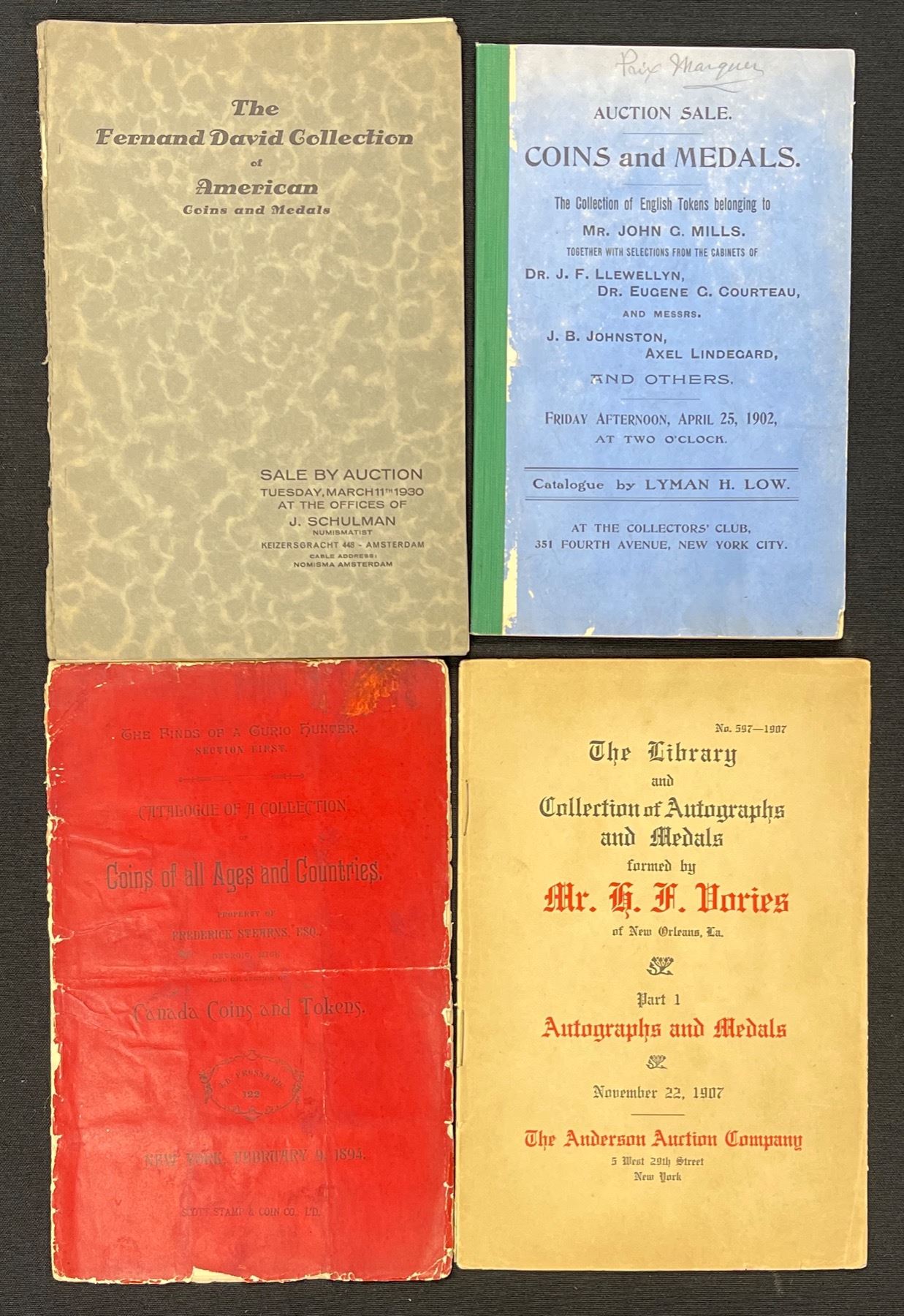 4 neat older catalogues. 1902 Lyman H. Low featuring the the Dr. Eugene Courteau collection; Coins of All Ages and Countries featuring the collection of Frederick Stearns, E.D. Frossard dated 1894, loose covers; The Library and Collection of Autographs and Medals featuring the collection of G.H. Tories dated 1907; the Fernand David Collection of American Coins and Medals, J. Schu.lman dated 1930, loose covers. 4 great catalogues. 4 Pcs.