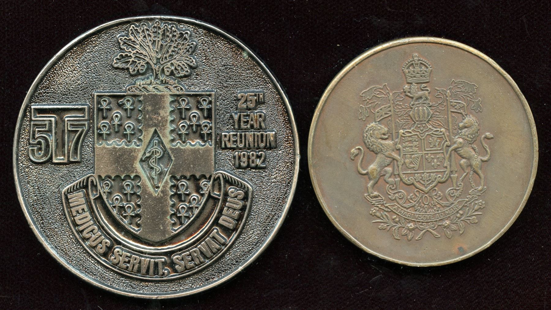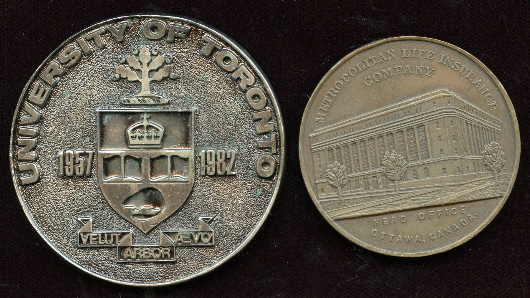 Lot includes: Metropolitan Life Insurance Company - Head Office Ottawa Canada, reverse depict Canada's armory. Bronze, approx 2 inches, AU. 1957 - 1982 25th Year Medical reunion, WM. 2 Pcs.