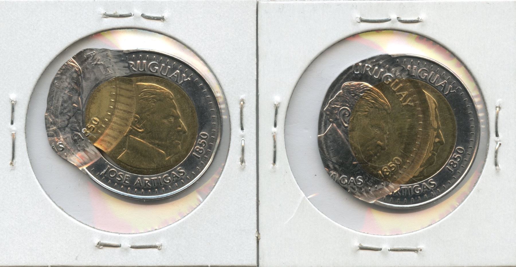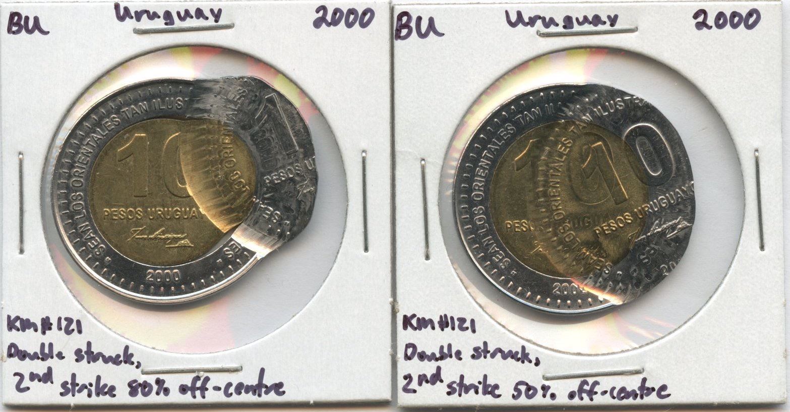 Pair of Uruguay 10 Peso Uruguayos (KM #121) bimetallic striking errors. Both coins are double struck, with the 2nd strikes 50% and 80% off-centre. Huge eye-appeal to these coins. Patrick Glassford Collection.