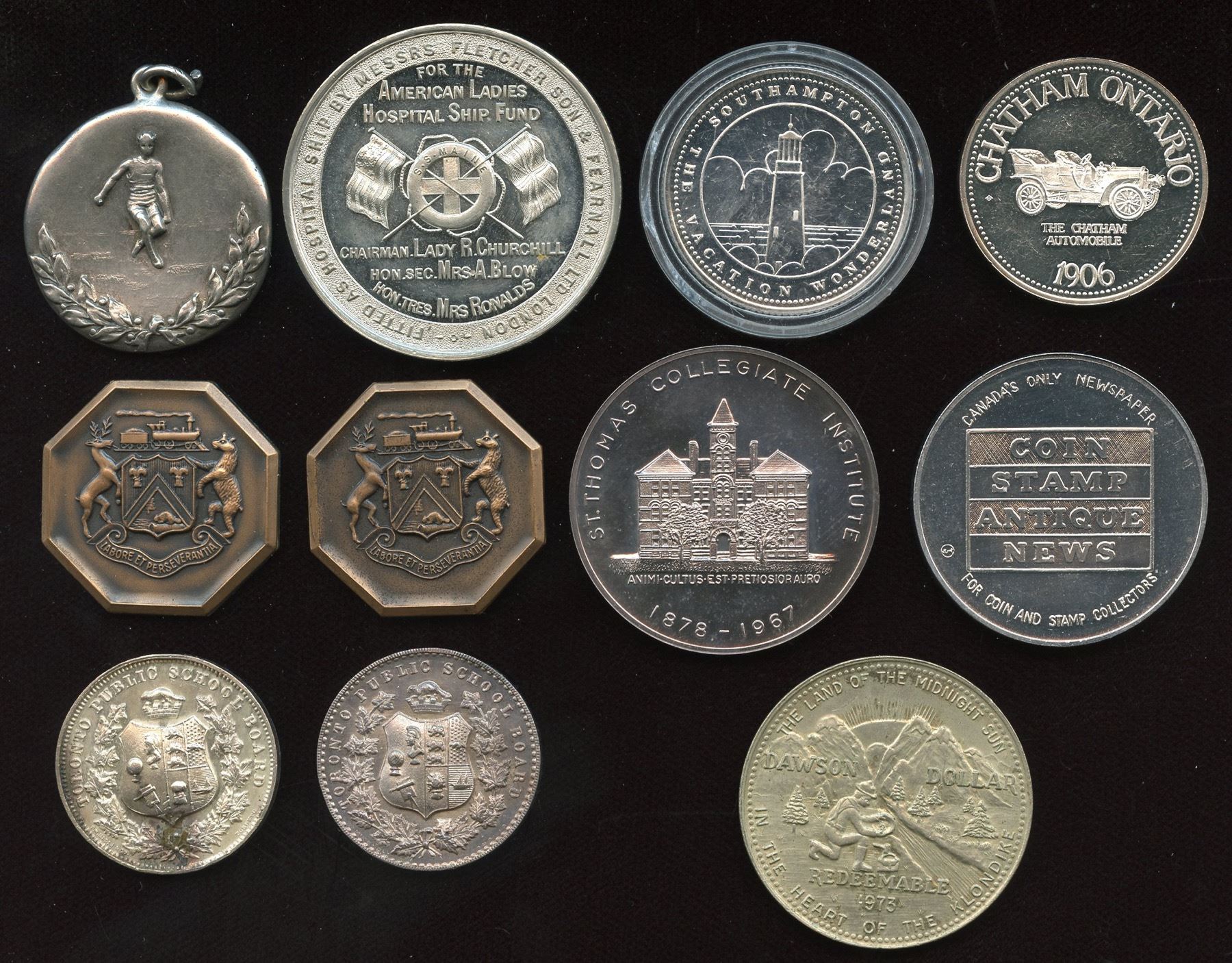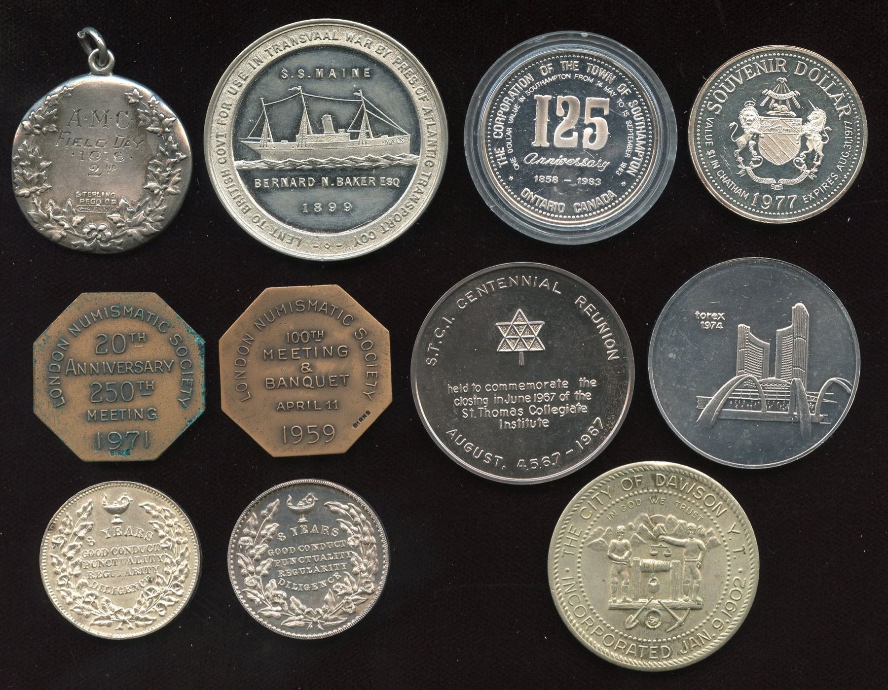 Canadian Numismatic Association bronze medals, London, 1971, 2 Pcs; 1899 silver in case of issue, "S.S. Maine, fitted as a hospital ship for the Transvaal War", UNC; Toronto Public School Board, 8 year medals, silver, 2 Pcs.; Centennial medal, St. Thomas Collegiate Institute, silver, Unc; silver sports specimen, "A.M.C. Field Day, 1918, 2nd", looped; Dawson City trade dollar, 1973; trade dollars for Chatham, ON, 1983 and 1977; 1974 Torex aluminum medal. 11 Pcs.