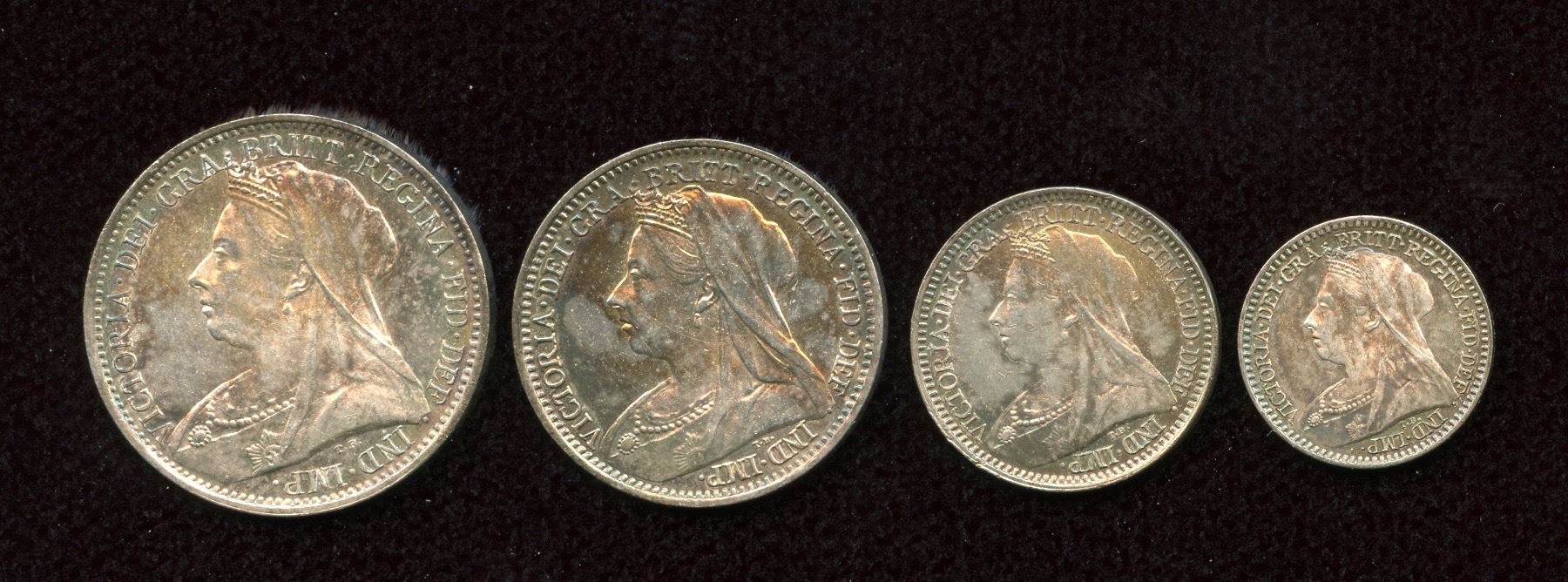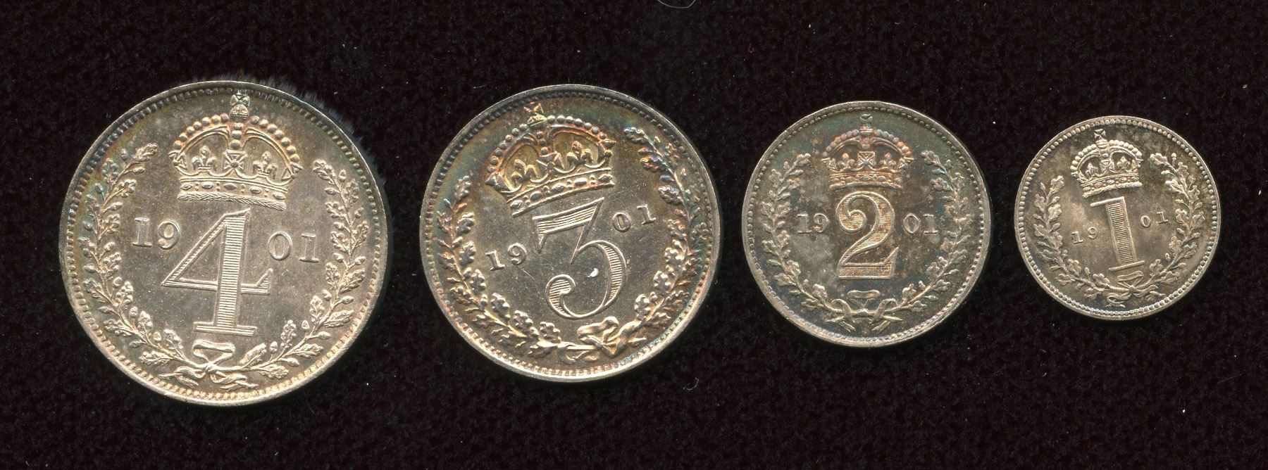 AR Maundy set. (4) Milled coinage. Dated 1901 Includes 1d, 2d, 3d, 4d. SCBC 3916 VF+.