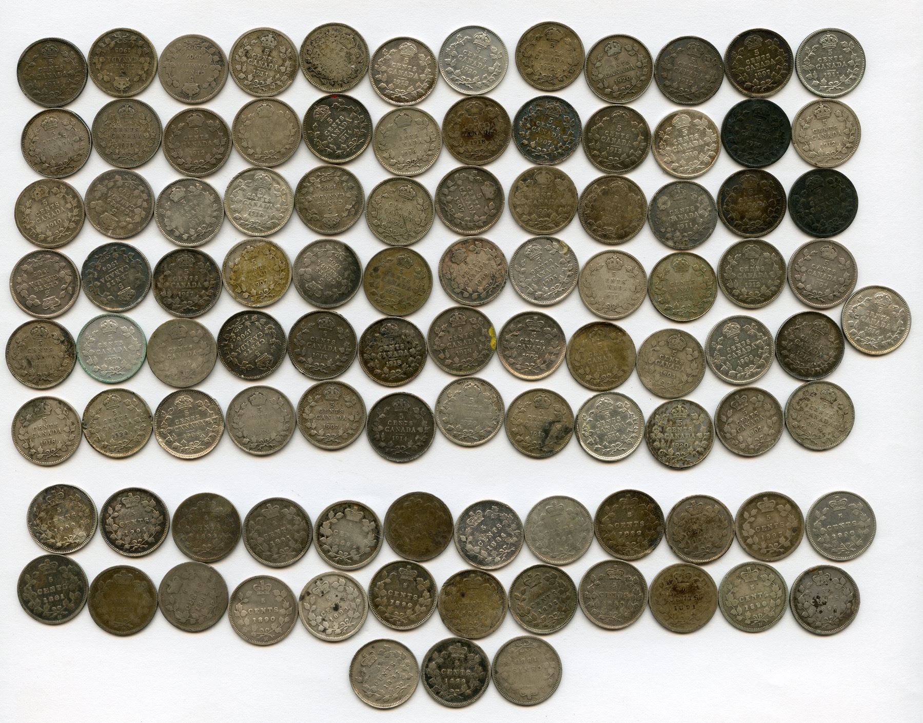 Victoria Five Cents, silver, Fair to AG, or VG with problems, (27); Edward and George silver five cents, AG-G, or VG with problems, (73); They all seem to have readable dates. Total of 100 pcs.