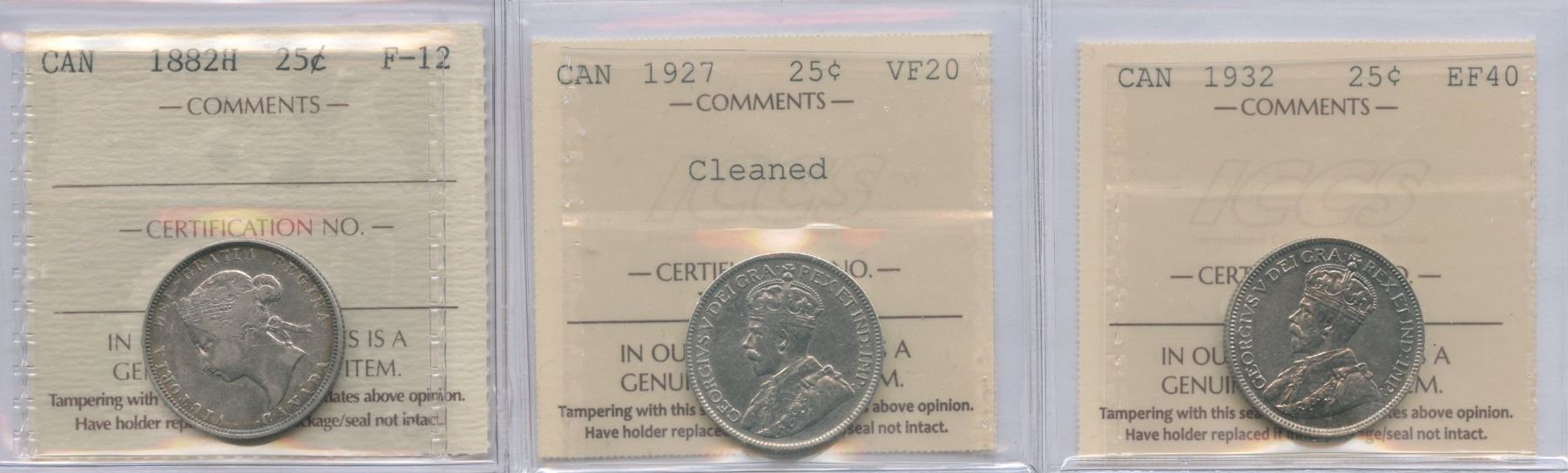 1882H ICCS F-12. Trace rainbow toning on obverse. Older 2-letter certificate.|| 1927 ICCS VF20; Cleaned; Semi-key date. || 1932 ICCS EF40. 3 Pcs.