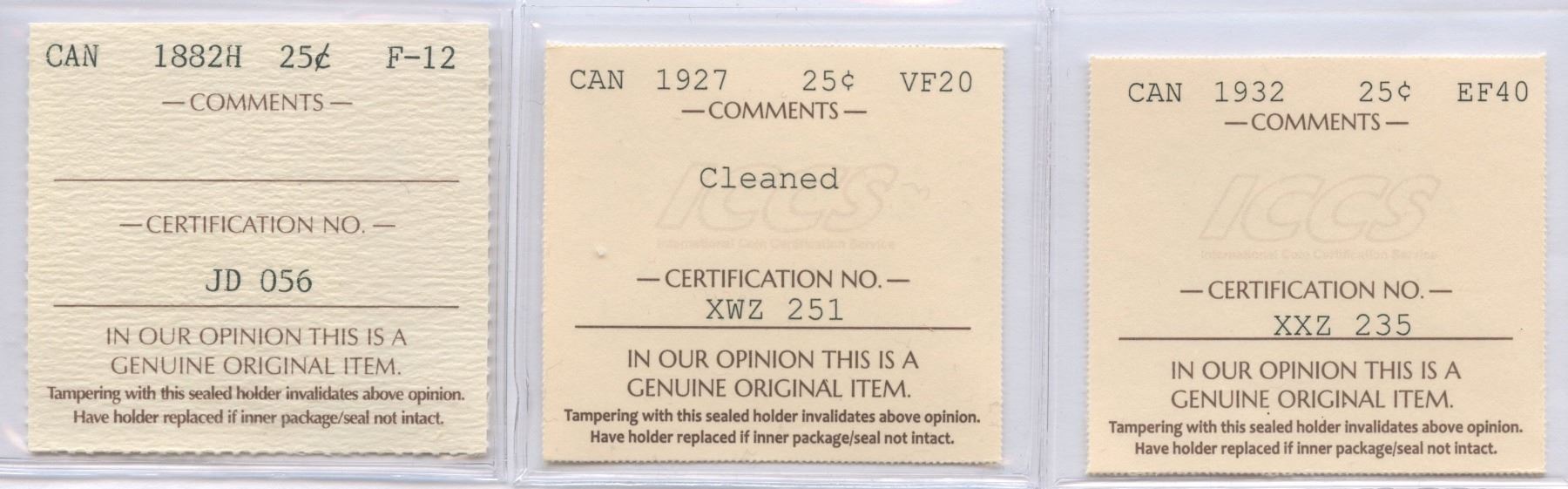 1882H ICCS F-12. Trace rainbow toning on obverse. Older 2-letter certificate.|| 1927 ICCS VF20; Cleaned; Semi-key date. || 1932 ICCS EF40. 3 Pcs.