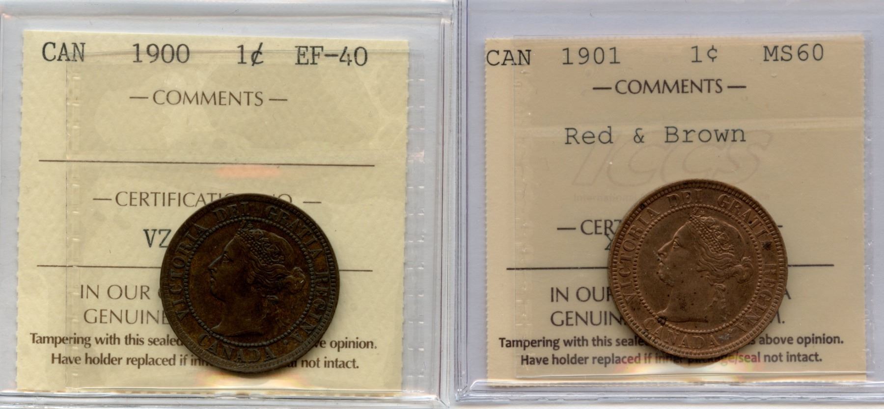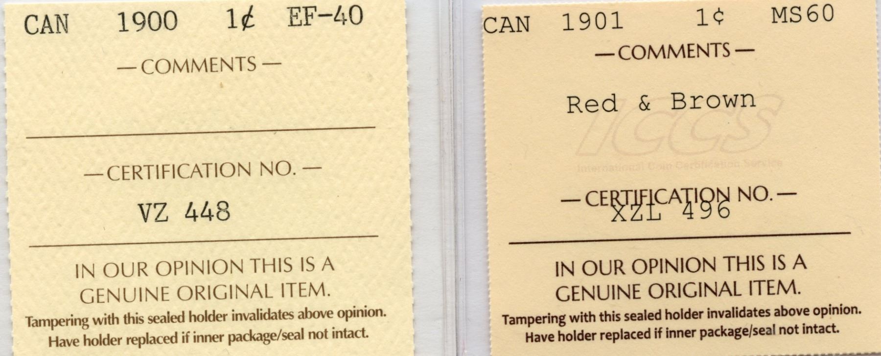 1900 ICCS EF-40; Older 2-letter certificate || 1901 ICCS MS60; Red & Brown. 2 Pcs.