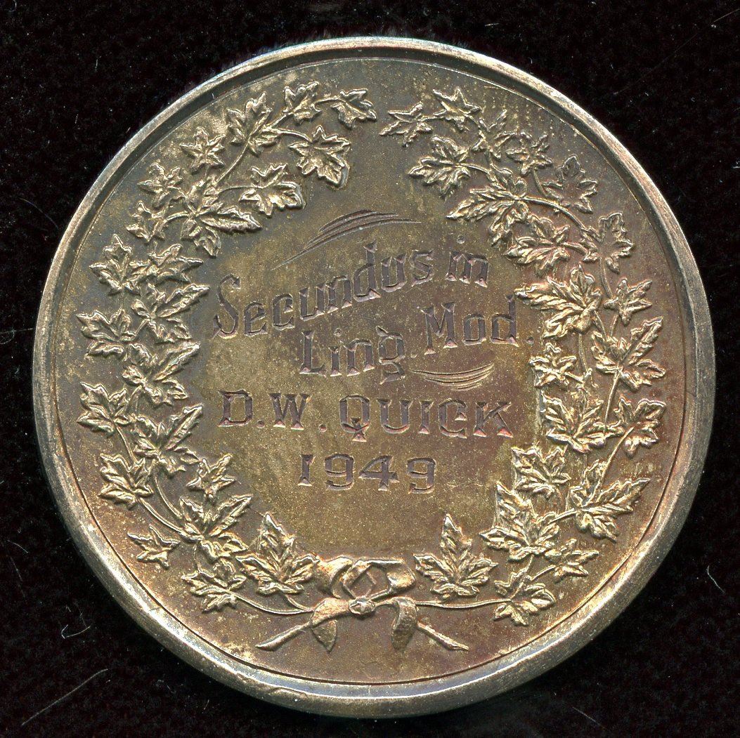 Victoria University, Toronto, silver, to "Secundus in/ Ling Mod/ D. W. Quick/ 1949", Produced by Kent and Son.