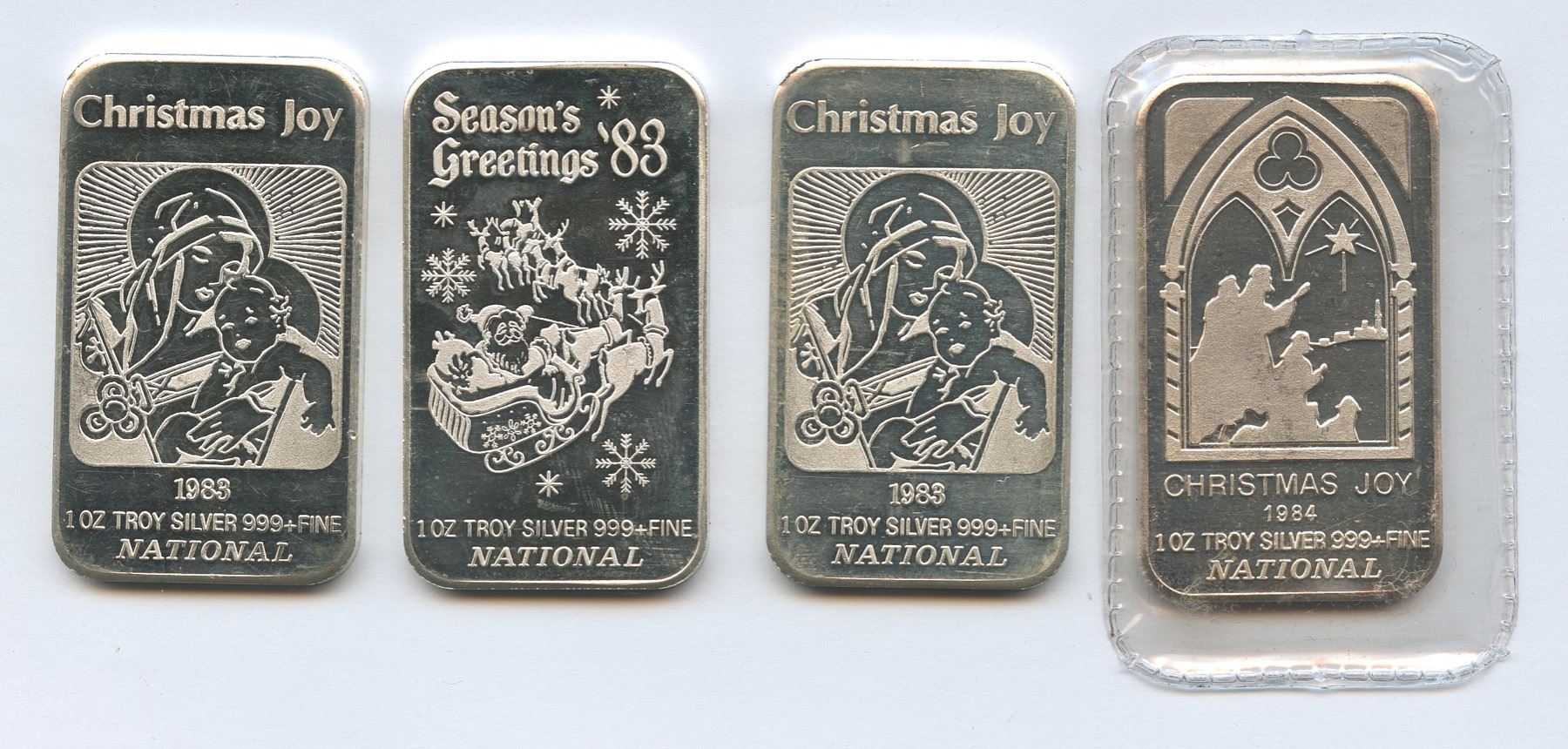 4 x 1oz Fine Silver bars from National. Season's Greetings '83; Christmas Joy 1984; Christmas Joy 1983 x 2.