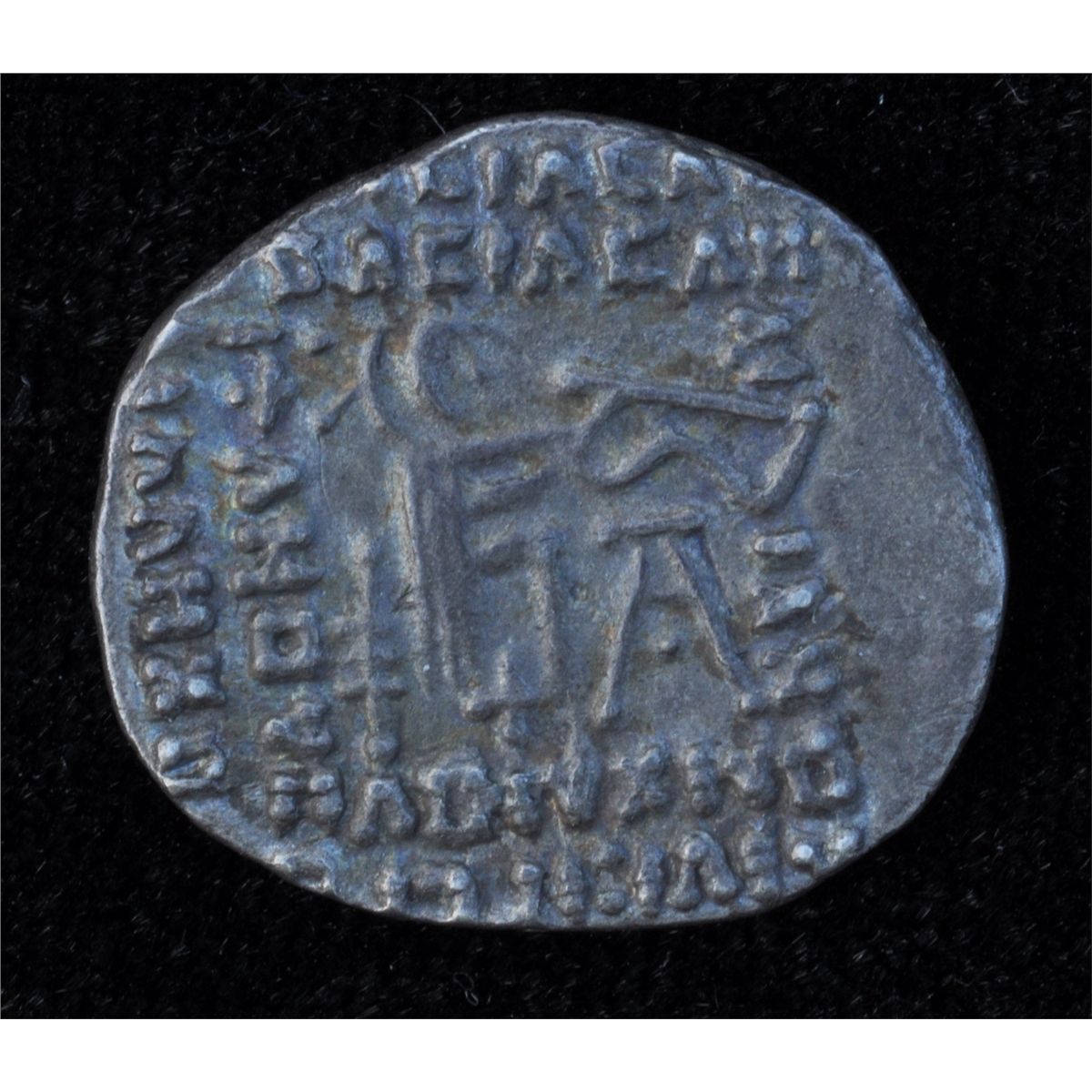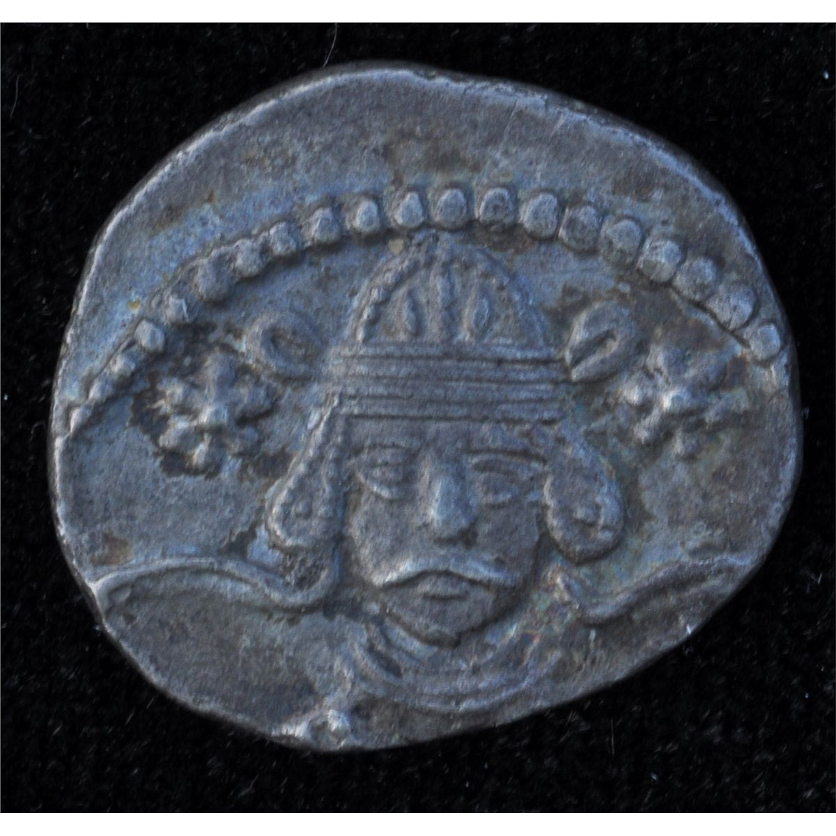 Vonones II (51 AD) - AR-Drachm Obv: Cuir. bust facing, wearing diad. tiara with horns, star on either side. Rev: Archer enthroned r. holding bow, monogram, 3.4 grams S-5797 Sellwood 67.1 Ex:Tucker Coll. VF.