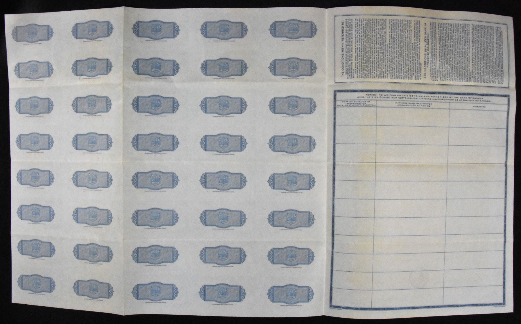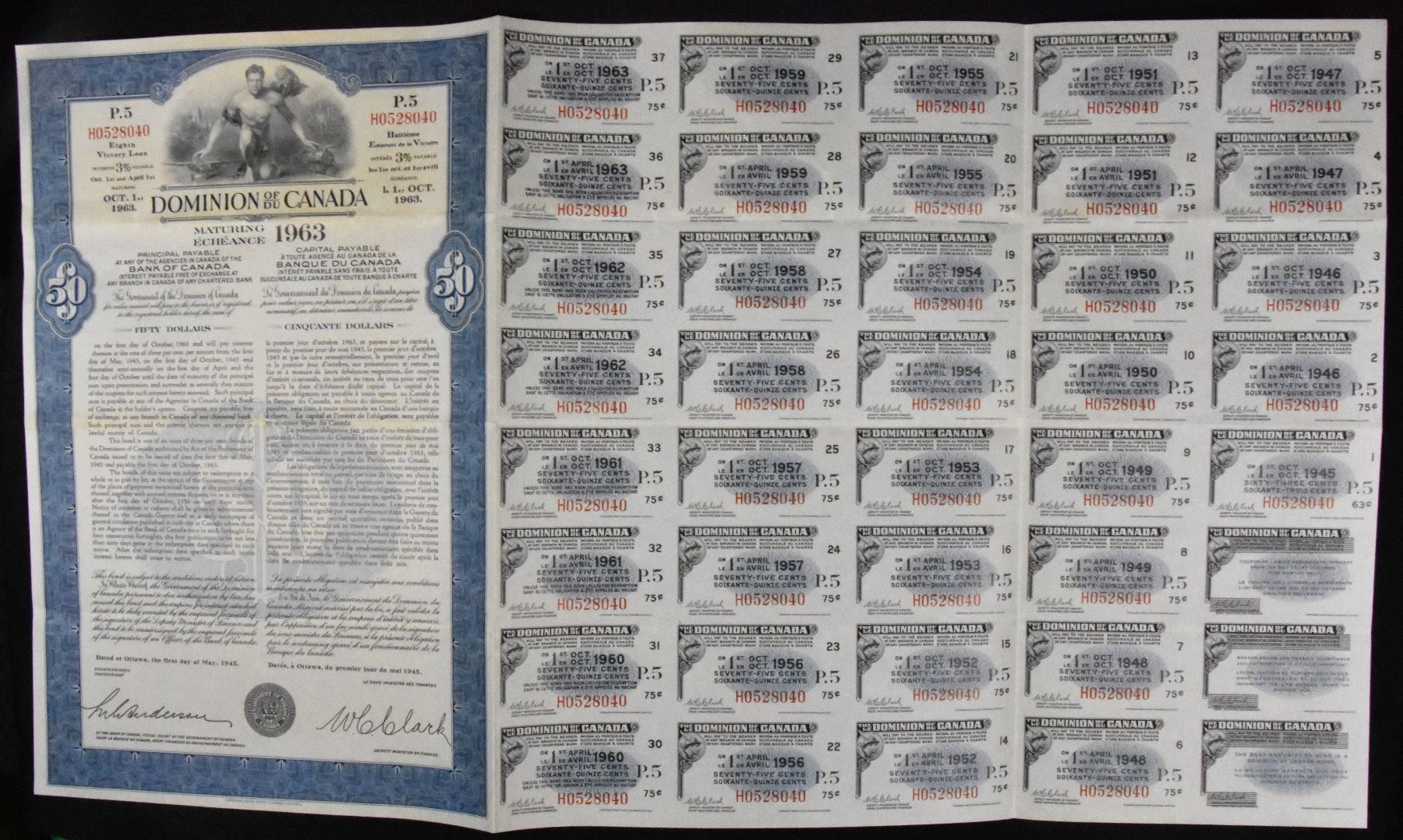 Dominion of Canada $50.00 1945 8th victory loan with all coupons attached, UNC. There were 11 such campaigns that was to become the forerunner of Canada savings bonds. These are VERY RARE and very collectible.