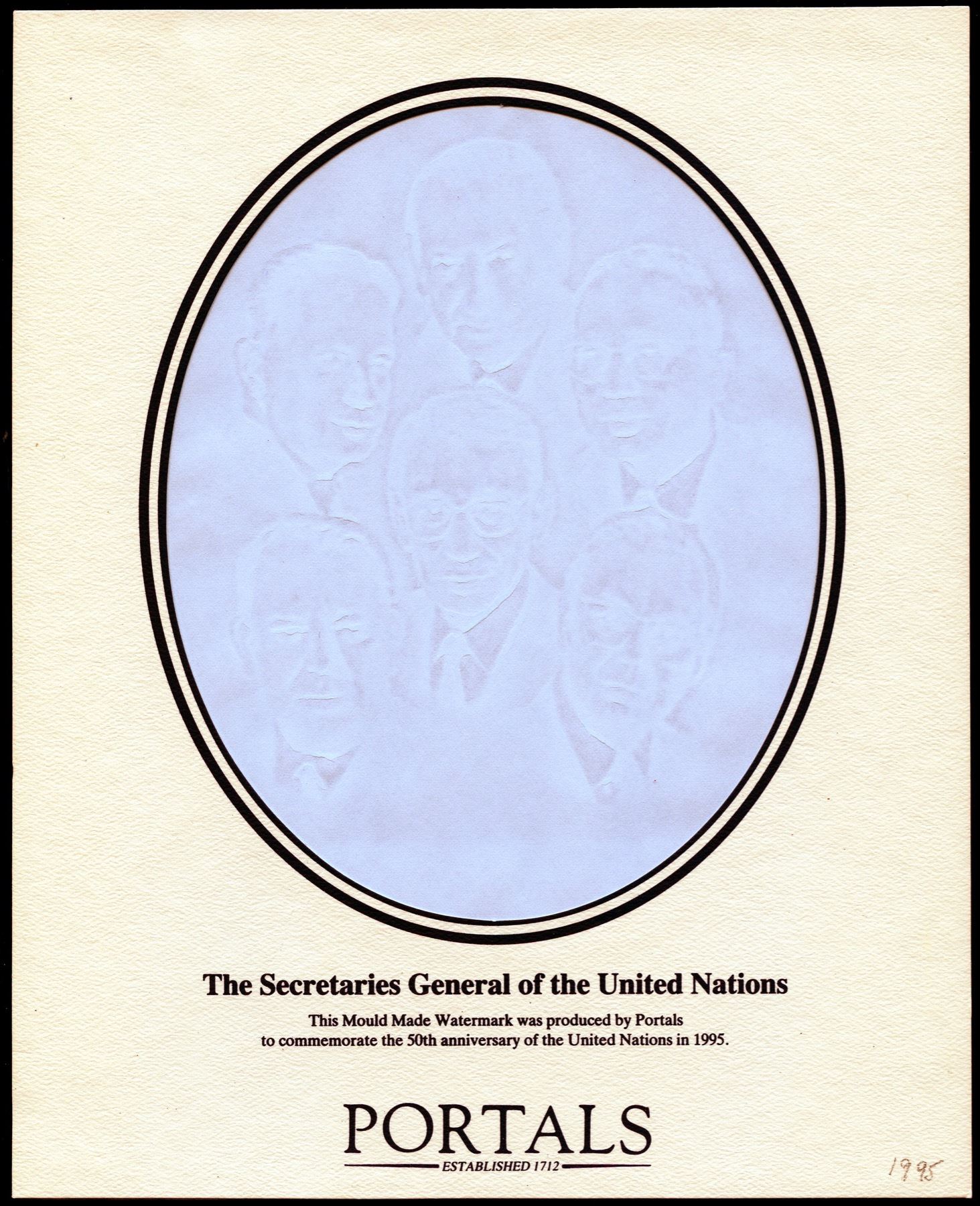 Portals Limited printed a series of Commemorative watermarked portraits in the 1990's. These were used on high quality paper for use on documents, travelers checks, gift vouchers, etc. but not on banknotes. The watermark images in this lot feature Christopher Columbus, Sir John Houblon, Alfred Nobel, Secretaries of the United Nations, Izaac Walton and Elizabeth the Queen Mother. There is background information but we would recommend viewing of this interesting lot.