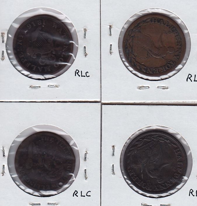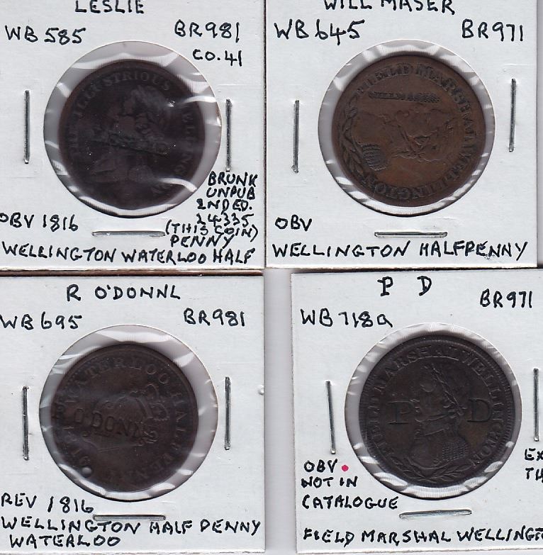 LESLIE on obv. of Wellington ½ penny, 1816, Br 981, C. 41 (M.I. 585, Brunk L-296); WILL MASER. on obv. of Wellington ½ penny, Br 971 (M.I. 645); R O’DONNL on rev. of Wellington ½ penny, 1816, Br 981 (M.I. 695); P D on obv. of Wellington ½ penny, Br 971. 4 Pcs.