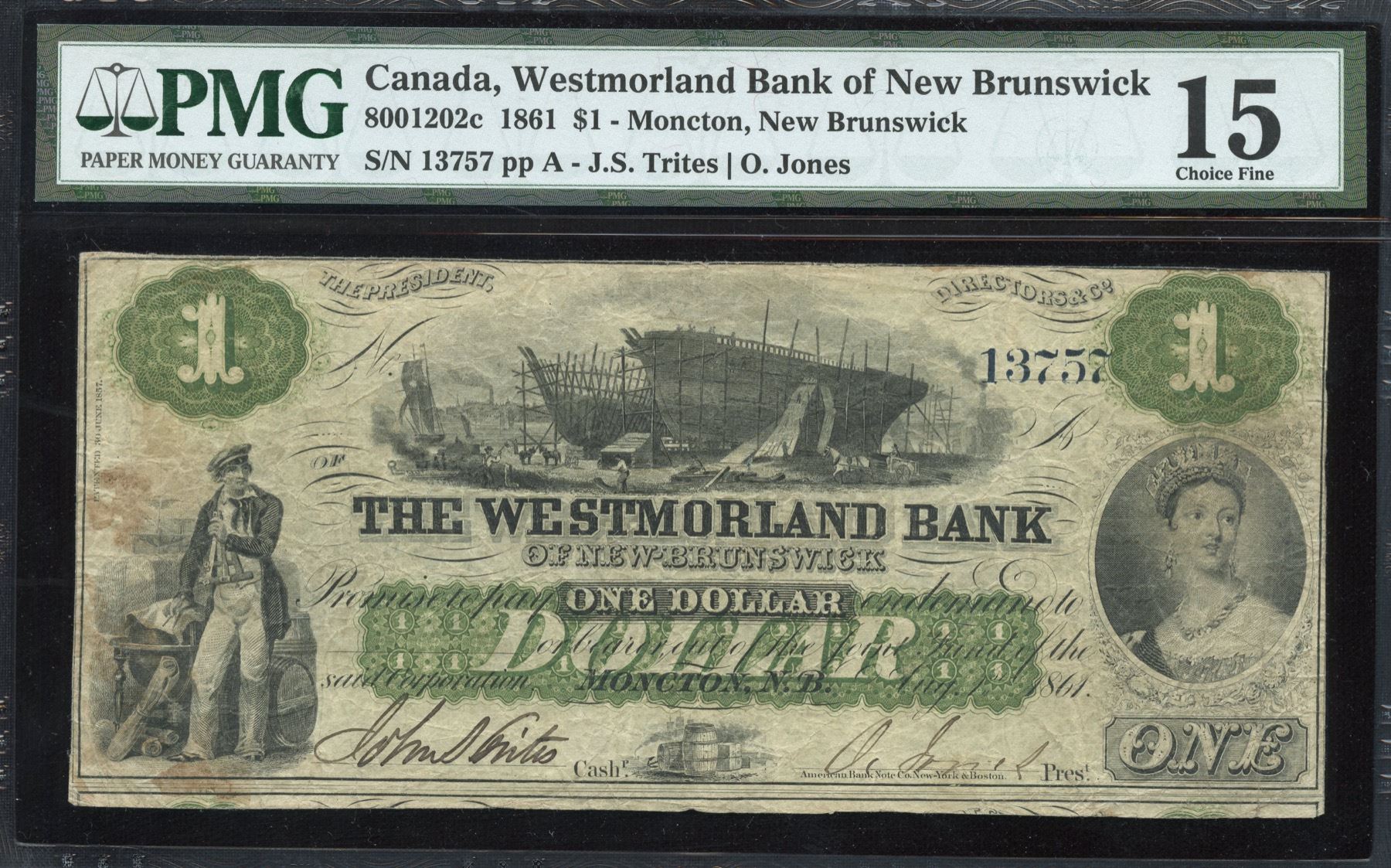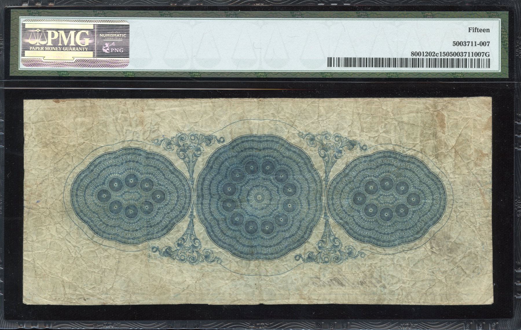 CH 800-12-02c. A decent example graded PMG F15. In October of 1863 instruction to remove the Rawdon Wright, Hatch & Edson imprint was executed nearing the end of this issue reducing the Jones-Jones signature combination production. This Trites-Jones signature combination even more rare. S/N:13757/B.