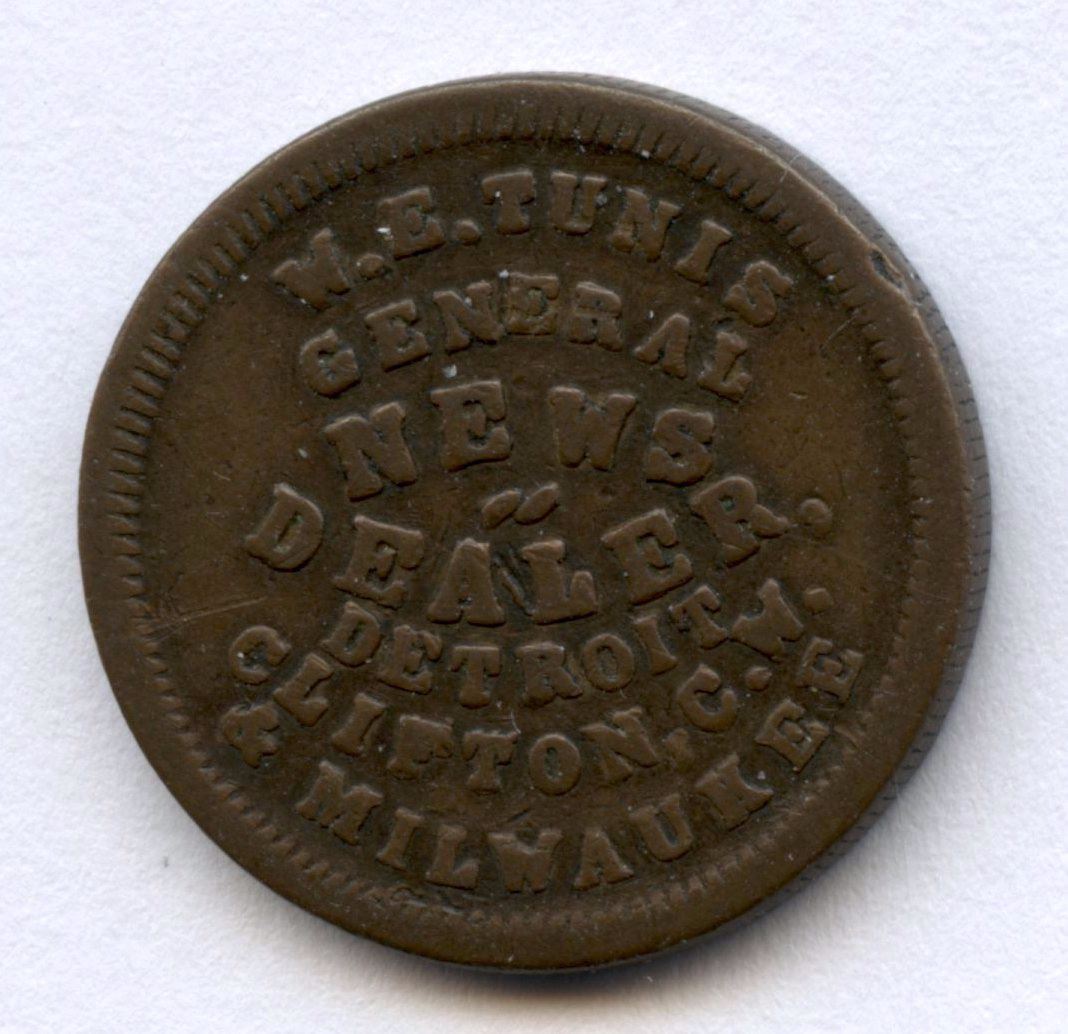 This US Civil War Store card is only one of 10,000 issuers having any connection to Canada. Tunis was in the newspaper distribution business selling Eastern newspaper to the West, and vice versa, by rail. He had depots at Detroit, Michigan, Milwaukee, Wisconsin and Clifton, CW. The village of Clifton eventually became Niagara Falls, Ontario. The token is listed under Detroit, MI as 225CF-1a (R6) in US Civil War Store Cards by G. and M. Fuld. Fred Bowman also listed the token under Clifton, ON as 222-A-A. Additional information regarding the issuer may be found in an article in the September 2003 issue of Numismatic Canada. Scarce token. Fine.