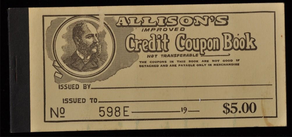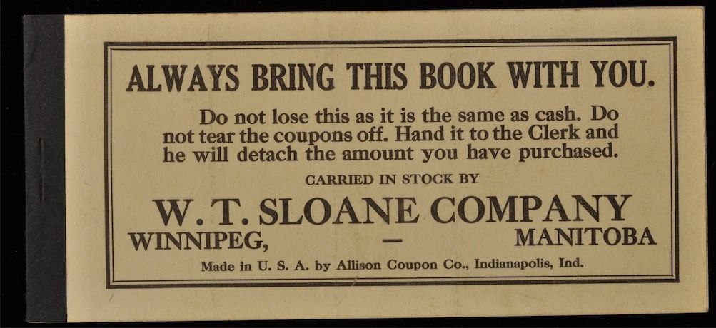 Winnipeg Manitoba Credit Coupon Book - Produced by Allison's for W.T. Sloane Company. This is complete with Five Dollars of one, two, five, Ten and Twenty Five Cent sheets. These are serial numbered 598E. Excellent condition.