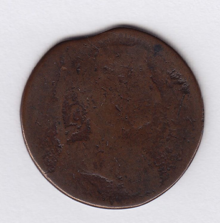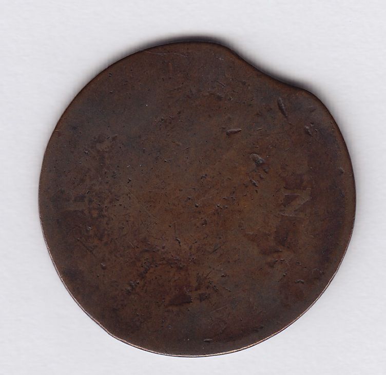 Wood 24 - The famous Riseing Sun Tavern variety, CH BL-41, copper, about 90 degrees off straight, planchet clip above the bust at 11 to 12 o’clock, otherwise a fairly attractive planchet, but no better than Fine on the obverse and about VG on the reverse where only the letters R, part of the I, part of the S, an N, a second N, and the top of an E are legible. Ex: James Curto; Warren Baker.