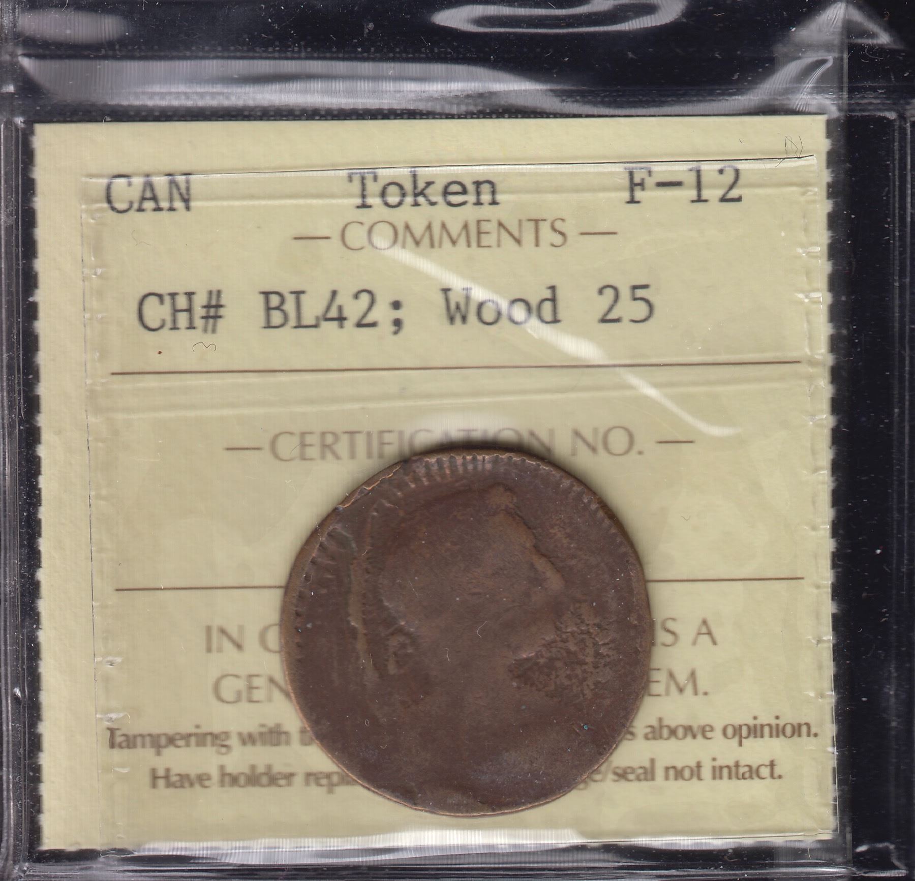 CH BL-42. N.S. ICCS F-12. The lightest Blacksmith in the collection at 2.78 grams. The Montreal Blacksmith obverse mated with the reverse of the Starbuck scorecard of Troy, N.Y.