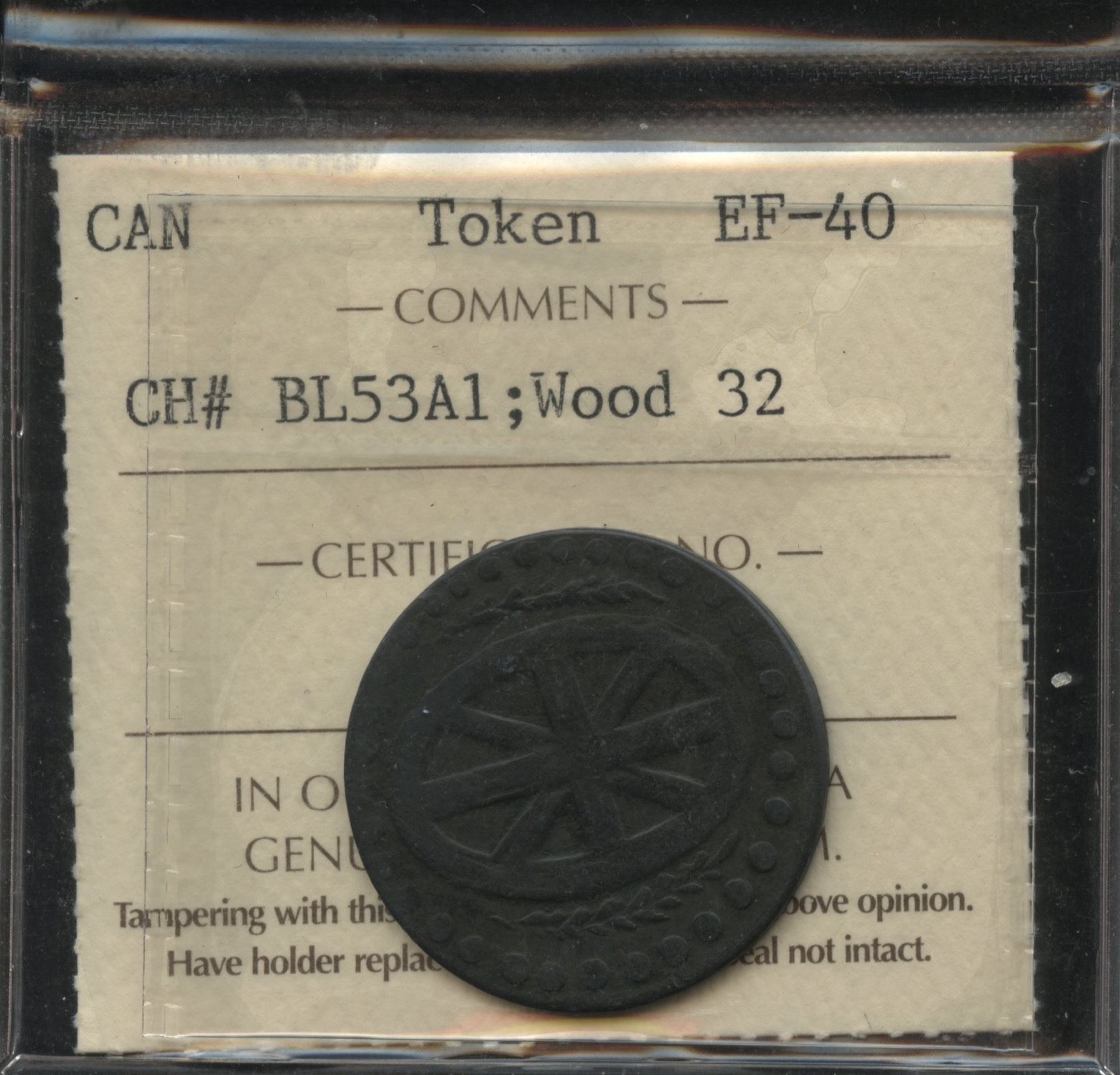 CH BL-53A1. ICCS EF-40. Howland Wood concluded that the reverse was inspired by the Habitant token reverse which bore arms similar to those of Montreal, within an oval. The arms of Montreal were devised by Jacques Viger, Mayor of Montreal in 1833, but the central area is composed of the St. Andrew's cross, not the Union Jack which appears on the Blacksmith copper, as Wood himself points out. Rare.