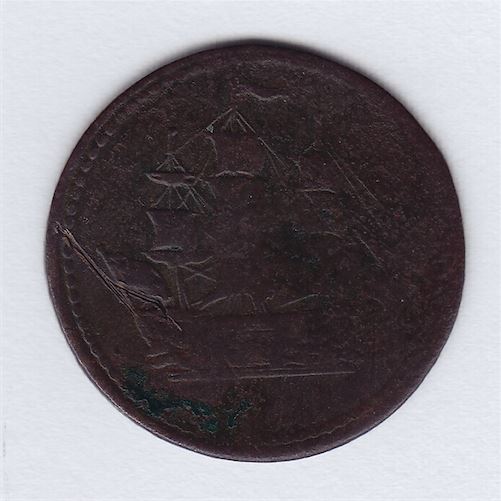 Wood 9b. Lees 4. Ship/Ships Colonies & Commerce. - CH BL-24B. N.S. 3.16 grams. F-VF, 2 scratches near flag, 1 below, the other to its left side to border. The reverse is one of the best I've seen, showing:
