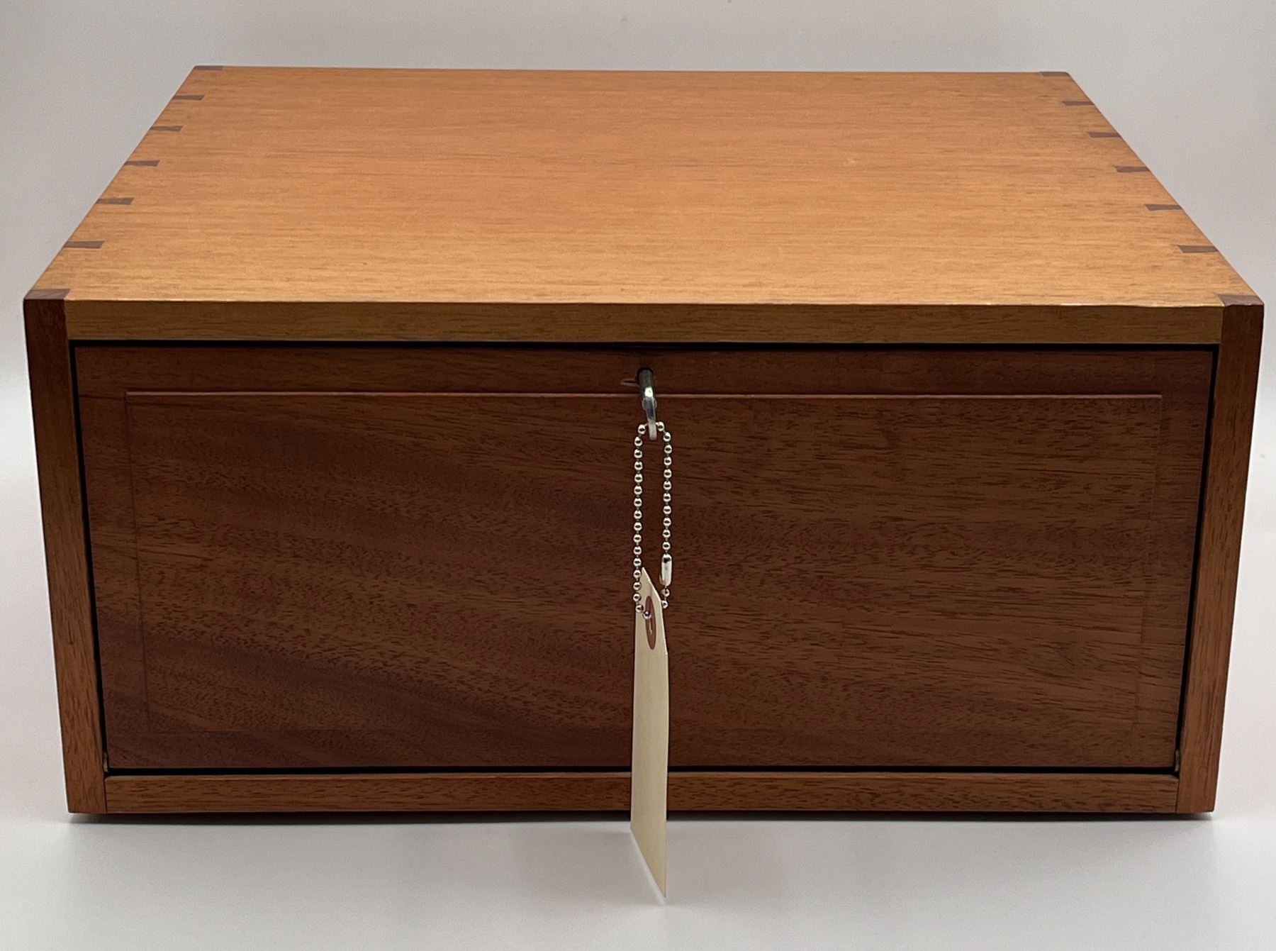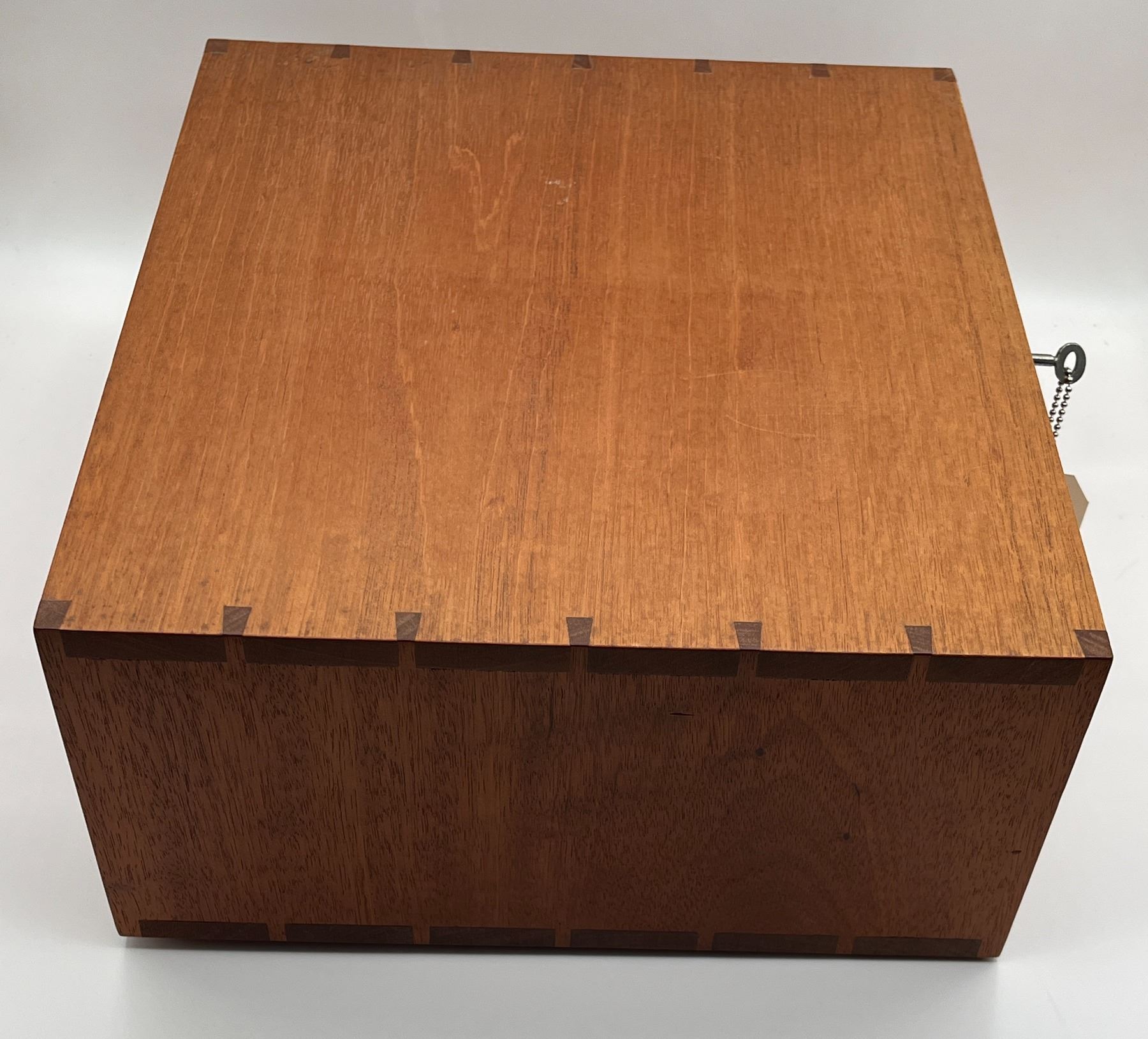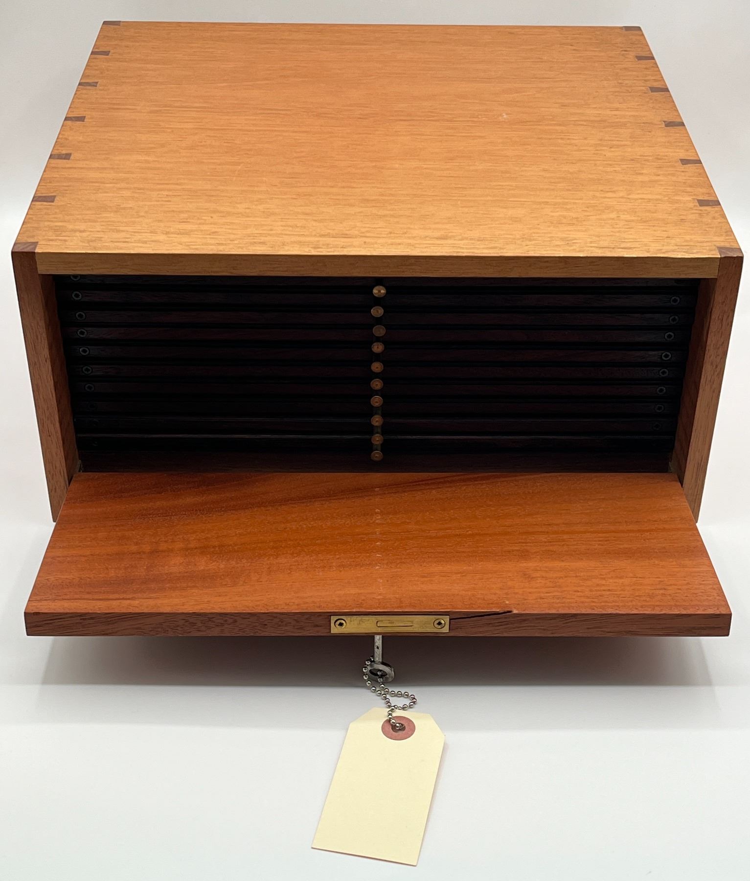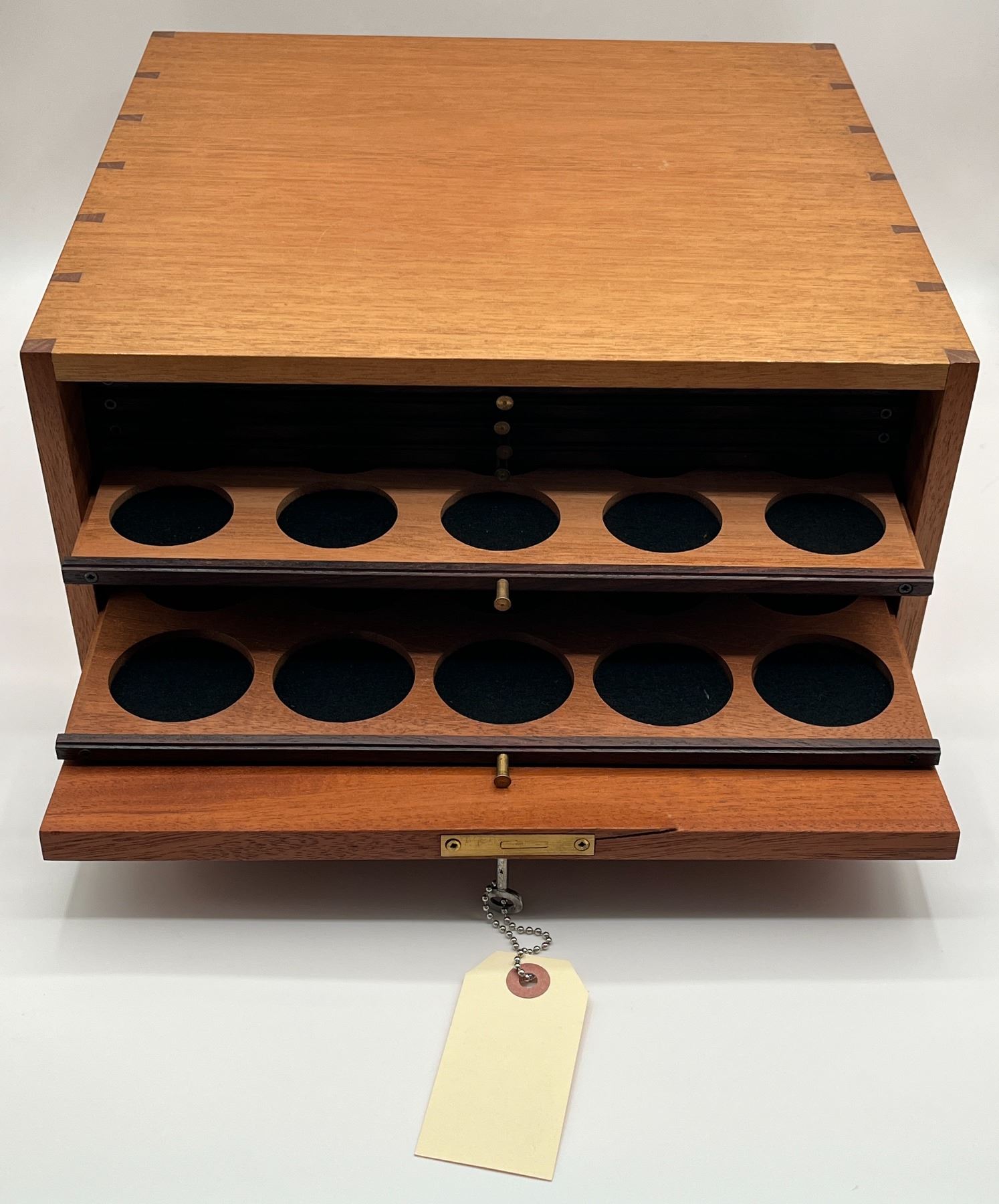 Wooden Coin Cabinet. Dimensions: Width 12.5", Depth 12", Height 6". Number of trays: 10. Accompanied by a key, overall in excellent condition.