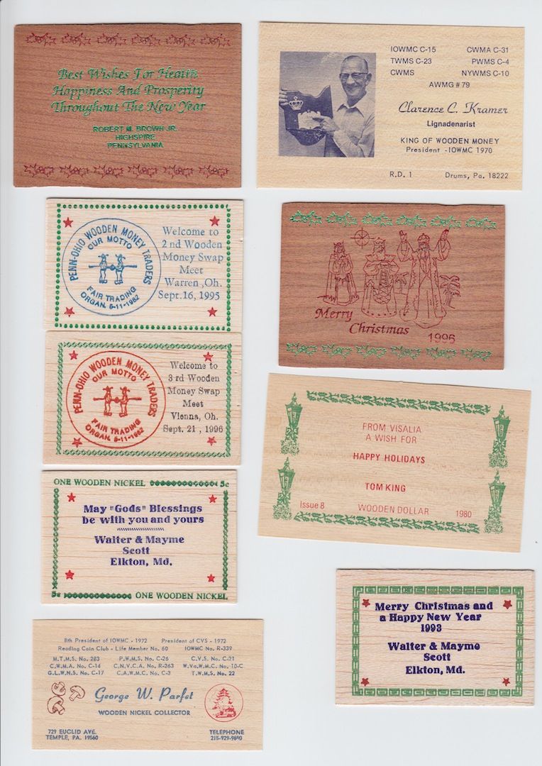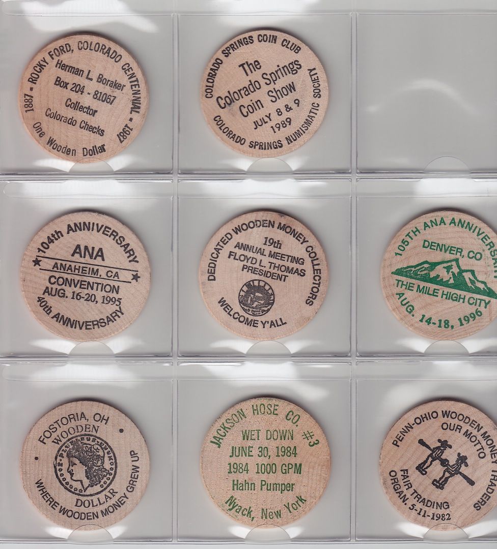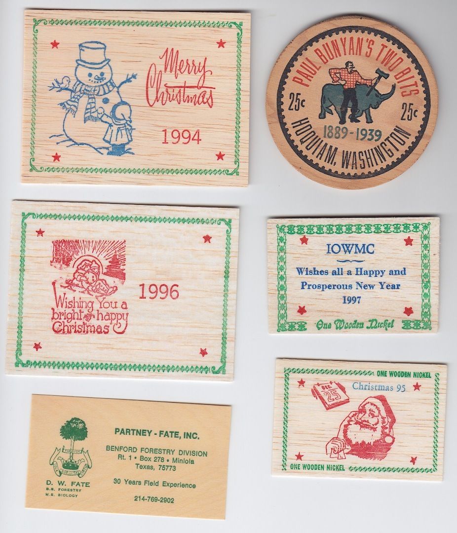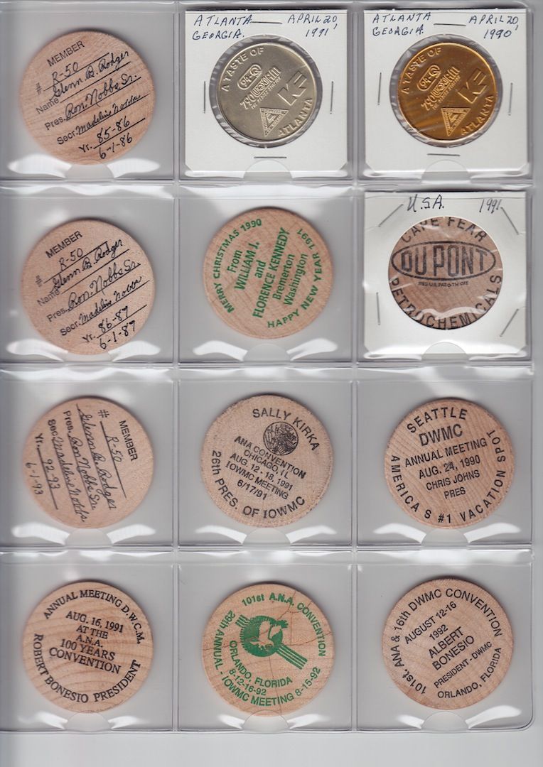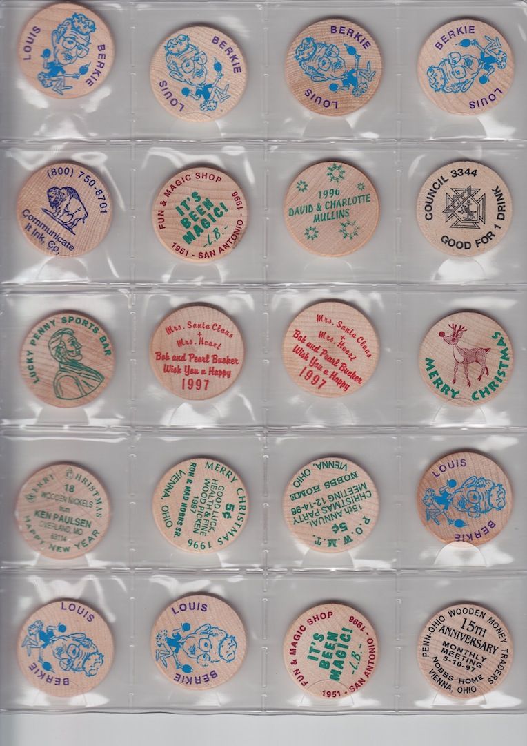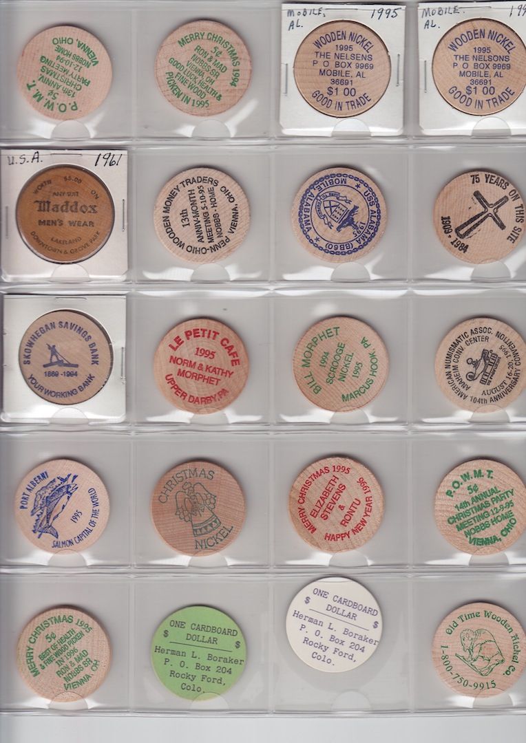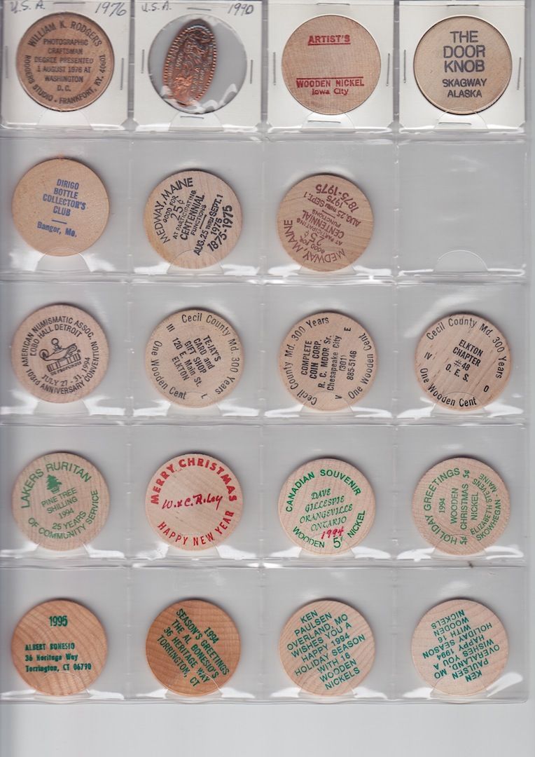 Over 130 flats and rounds of American wooden nickels. Ex Glenn Roger's Collection.