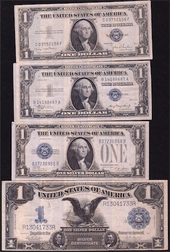 World Banknotes - Lot of Four US Silver Certificates - Includes: 1899 Parker/Burke, FR#232; 1928A Woods/Mellon, FR#1601; 1935D Clark/Snyder, FR#1607; 1935 Julian/Morgenthaw, FR#1613. Conditions range from XF to XF++. 4 Pcs.