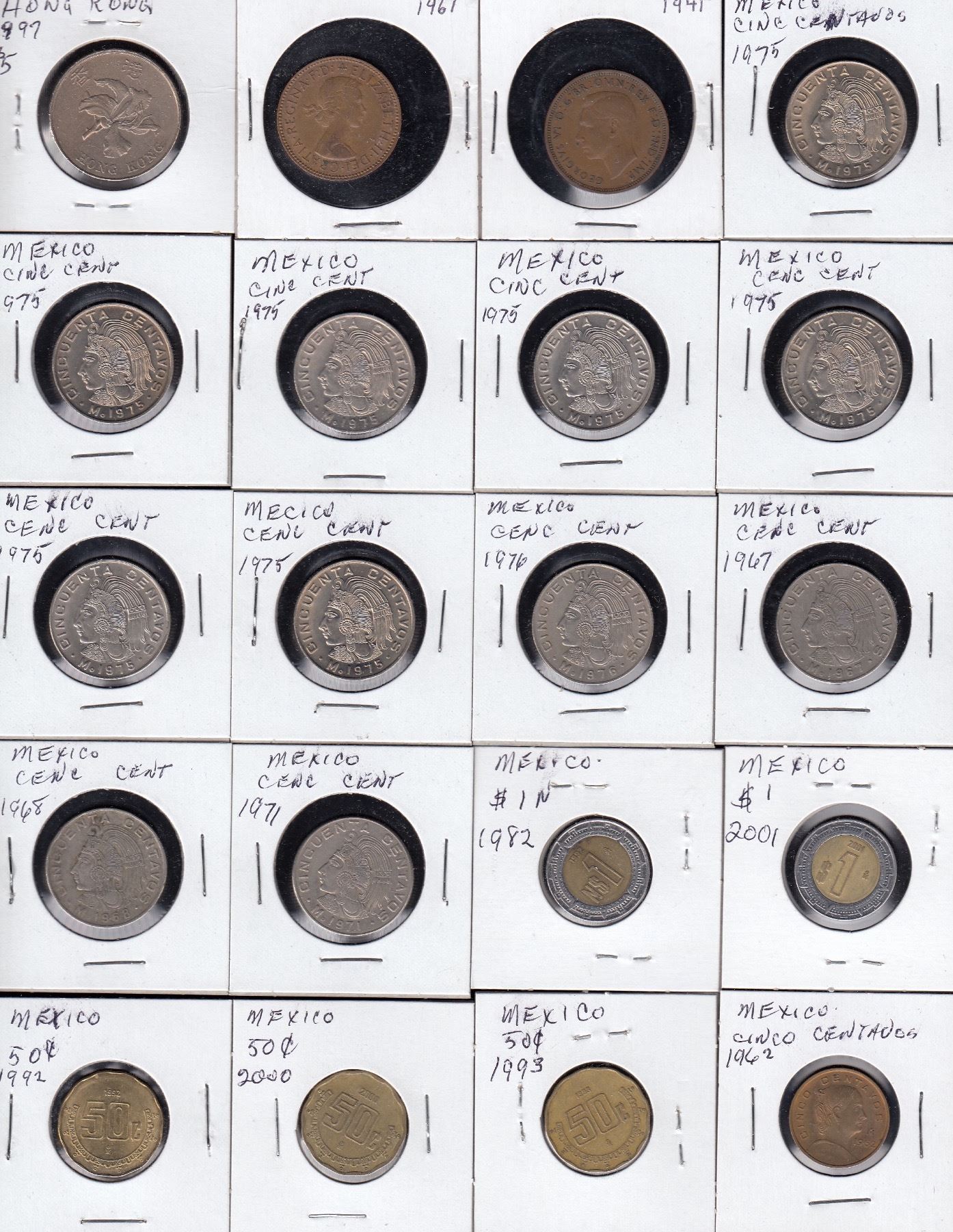 Countries include: Mexico, Barbados, Hong Kong, Great Britain, Germany and many others. Two small black coin boxes full of coins.