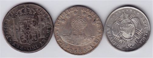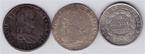 Includes: 8 Reales, 1818; 8 Soles, 1833; Boliviano, 1872. VF-XF. 3 Pcs.