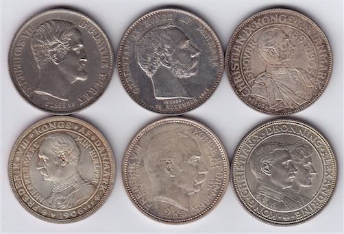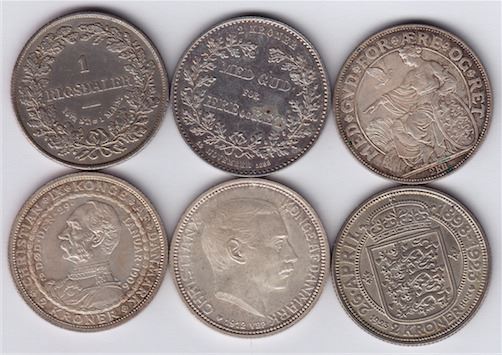 Includes: 1855 Rigsdaler, KM#760.2, EF; 1888 2 Kroner, KM#799, AU; 1903 2 Kroner, KM#802, AU; 1906 2 Kroner, KM#803, AU; 1912 2 Kroner, KM#811, AU; 1923 2 Kroner, KM#821, AU. 6 Pcs.