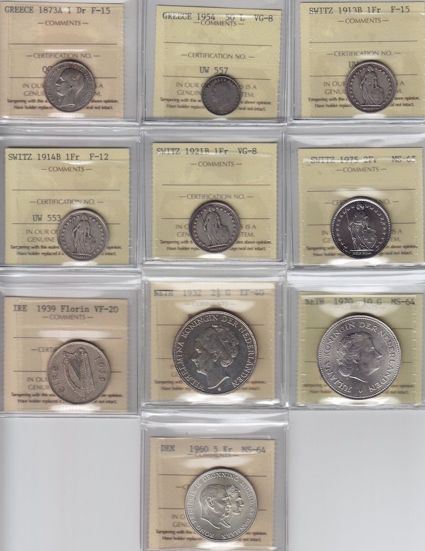 Lot of 10 ICCS Graded Coins: Greece 1 Drachma, 1873A, KM 38, ICCS F-15; Greece 50 Lepta, 1954, KM 80, ICCS VG-8; Switzerland 1 Franc, 1913B, KM 24, ICCS F-15; Switzerland 1 Franc, 1914B, KM 24, ICCS F-12; Switzerland 1 Franc, 1921B, KM 24, ICCS VG-8; Switzerland 2 Franc, 1975, KM 21a.1, ICCS MS-65; Ireland Florin, 1939,KM 15, ICCS VF-20; Netherlands 2-1/2 Gulden, 1932, KM 165, ICCS EF-40 (Polished); Netherlands 10 Gulden, 1970, KM 195, ICCS MS-64; Denmark 5 Kroner, 1960,KM 852, ICCS MS-64. 10 Pcs.