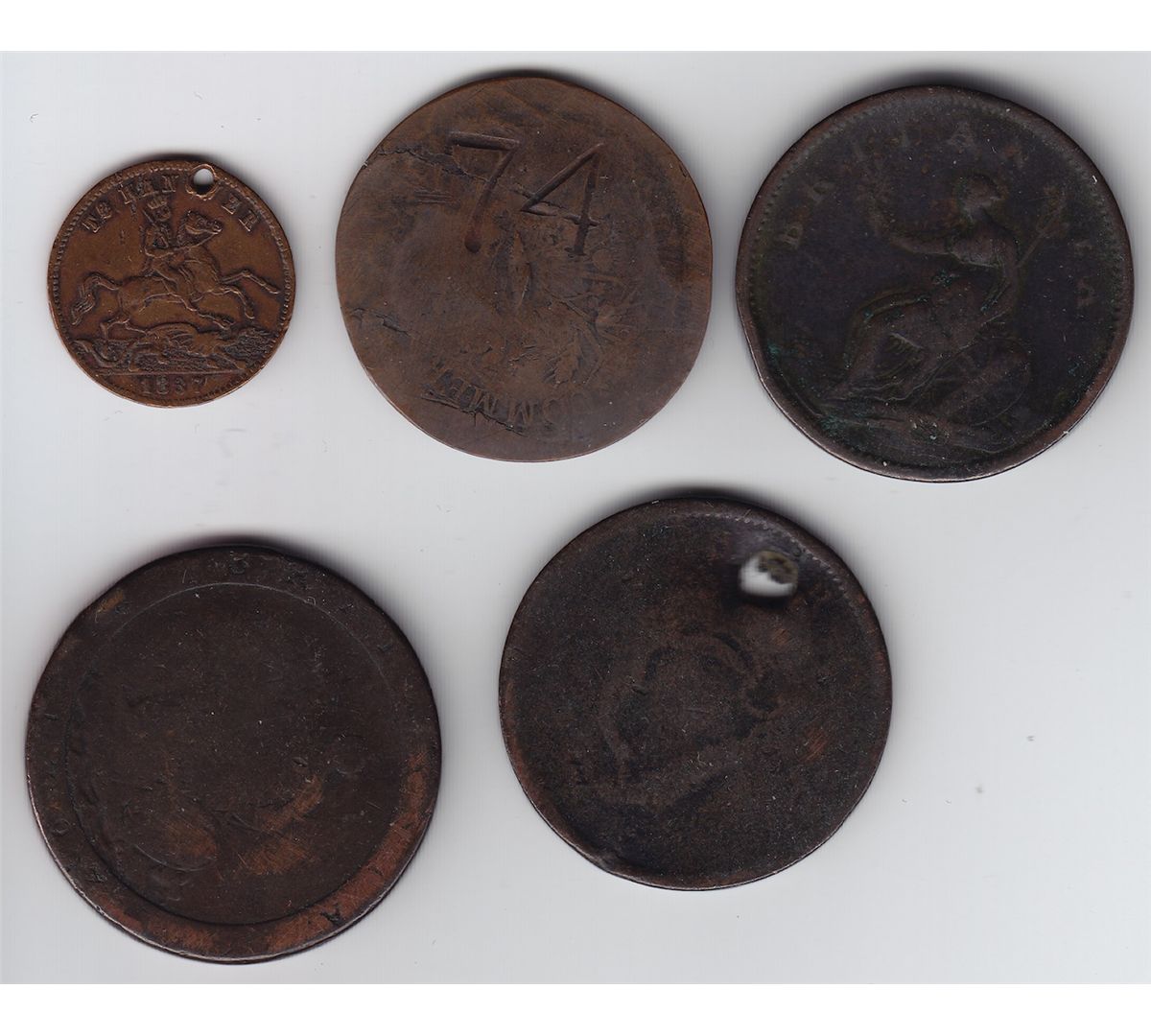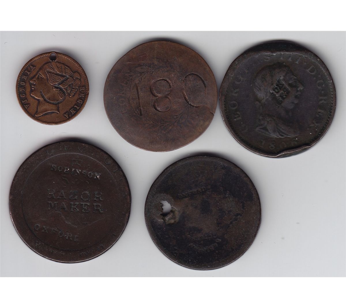 British Condor token c/s "3"; British one penny c/s "Robinson/Razor/Maker/Oxford"; Irish penny c/s " Robinson/Cutler/Oxford"; 1806 British penny c/s "---son/---iers"; British Commercial token c/s " 74 on obv and 180 on rev". 5 Pcs.