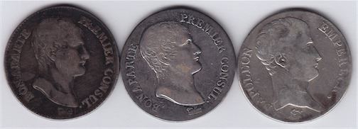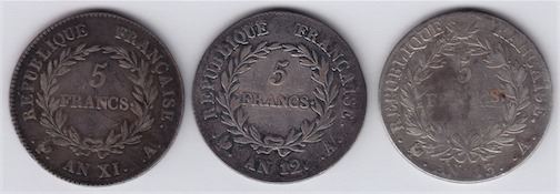 Includes: ANXI A, 5 Francs, KM#650.1, F-VF; ANXII A, 5 Francs, KM#659.1, aVF; ANXIII A, 5 Francs, KM#662.1, Fine. 3 Pcs.