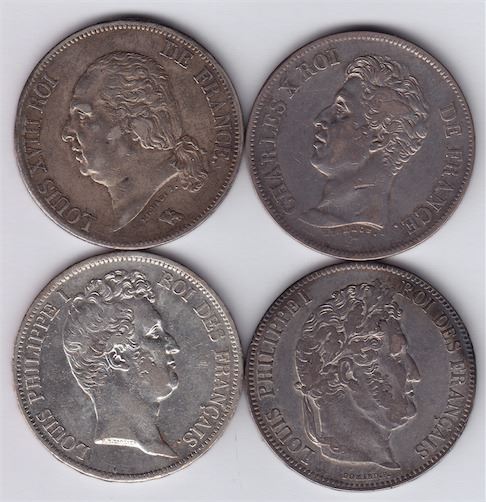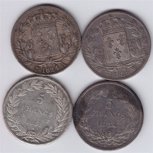 Includes: 1824A 5 Francs, KM#711.1, VF; 1826W 5 Francs, KM#720.13, aVF; 1831W 5 Francs, KM#735.13, VF; 1834H 5 Francs, KM#749.5, VF+. 4 Pcs.