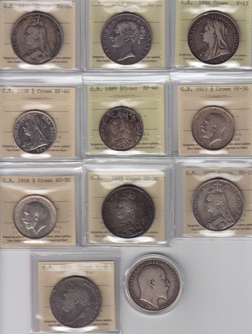 Includes: George IV Crown, 1821, KM680.2, ICCS VG-8; Victoria Crown, 1845, KM745, ICCS VG-10; George V Half Crown, 1915, KM 818.1, ICCS VF-30; George V Half Crown, 1918, KM818.1, ICCS AU50; Victoria Crown, 1889, KM765, ICCS VF-30; Victoria Crown, 1890, KM 765, ICCS VG-10; Victoria Crown, 1892, KM 765, ICCS VG-10; Victoria Crown—LVII, 1894, KM 783, ICCS F-12; Edward VII Crown, 1902,KM 803, VF30, in red velvet case; Victoria Half Crown, 1889, KM 764, ICCS EF-40. 11 Pcs.